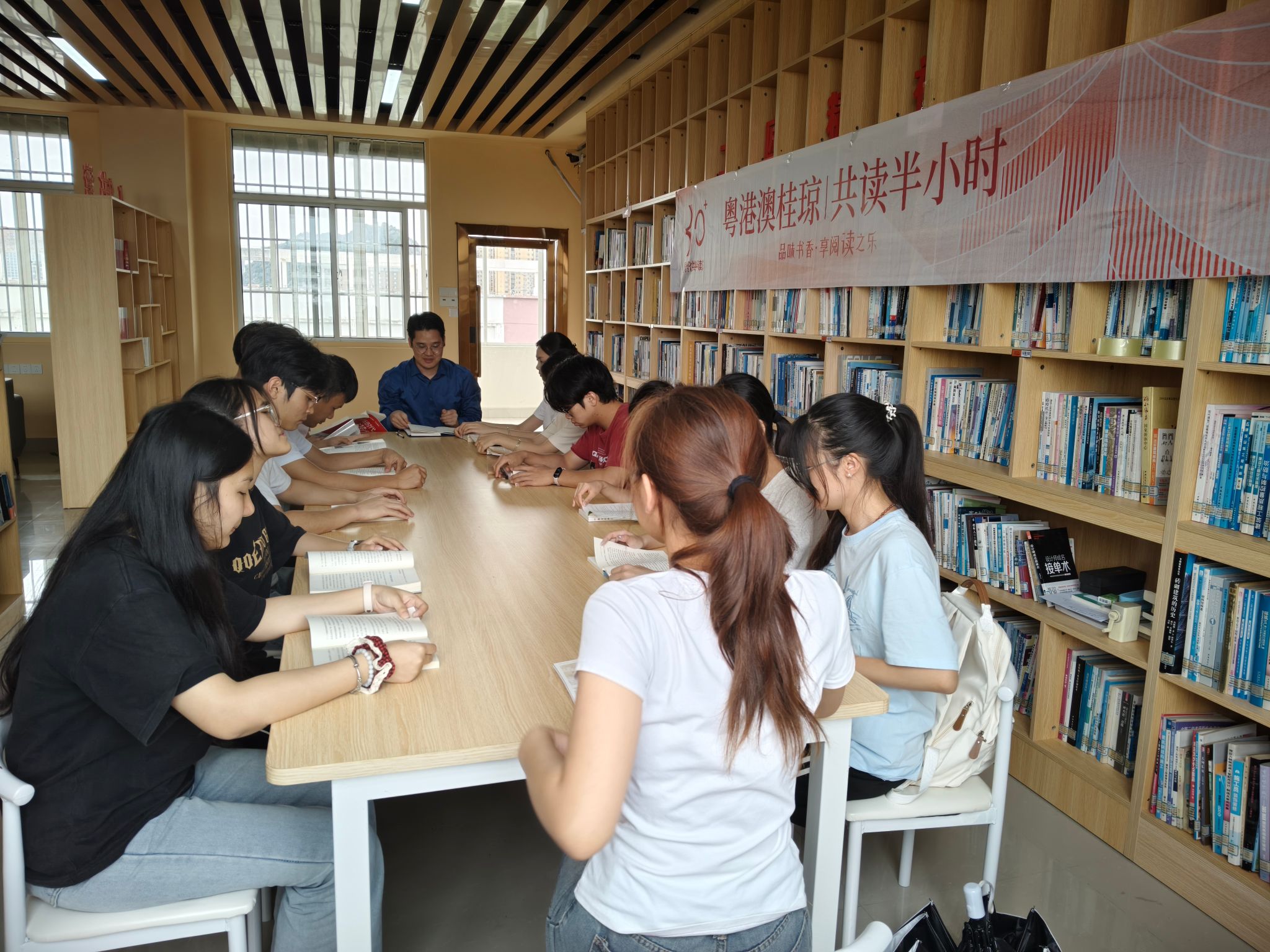 [本网讯]为深入贯彻落实全民阅读精神,积极响应粤港澳桂琼五地共读倡议,2026年4月23日,第31个“世界读书日”当天,我校图书馆组织各二级学院同步开展了“品味书香·享阅读之乐”2026年粤港澳桂琼“共读半小时”阅读活动。全校师生在同一时间、不同空间,以共读的方式向阅读致敬,营造了浓厚的书香校园氛围。