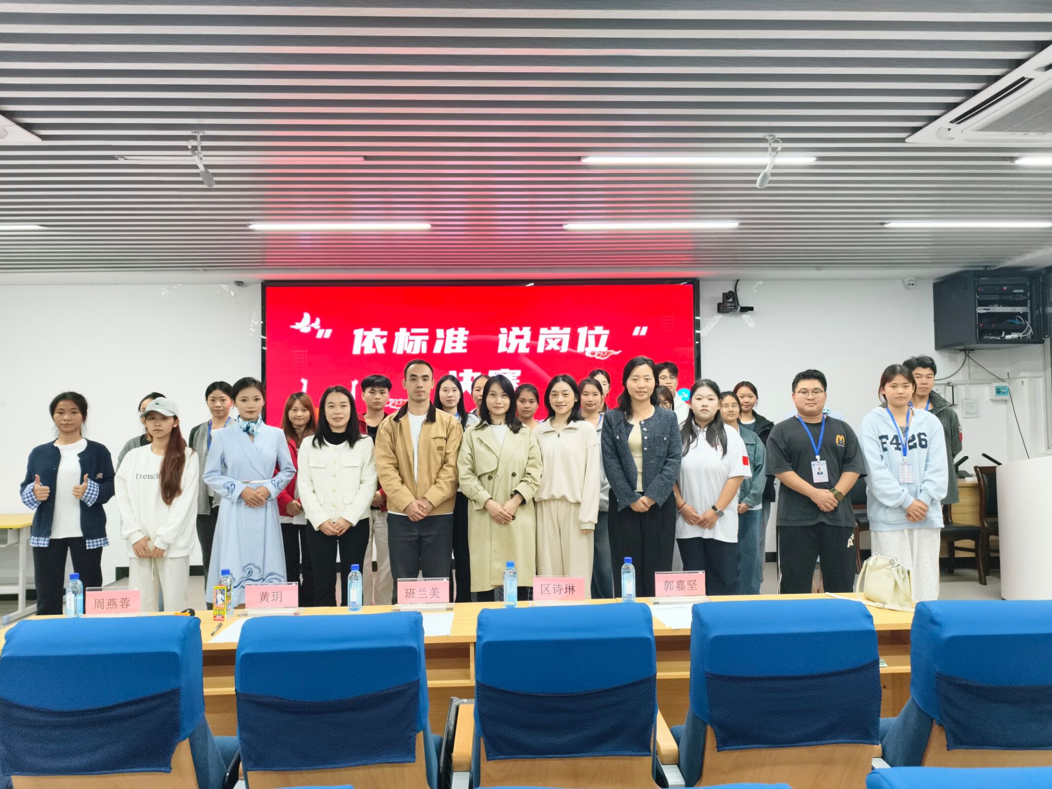 [本网讯]为进一步提升学生的专业素养,引导大学生树立正确就业观,帮助学生对未来职业生涯有更全面的理解和规划,经济管理学院于12月11日在长堽校区第四教学楼1-5报告厅举行第二届“依标准 说岗位”比赛决赛,学院党总支书记班兰美出席活动,专任教师代表黄玥、区诗琳、周燕蓉、郭嘉坚,院团委副书记刘义蕾担任评委,共有11支队伍参加决赛。