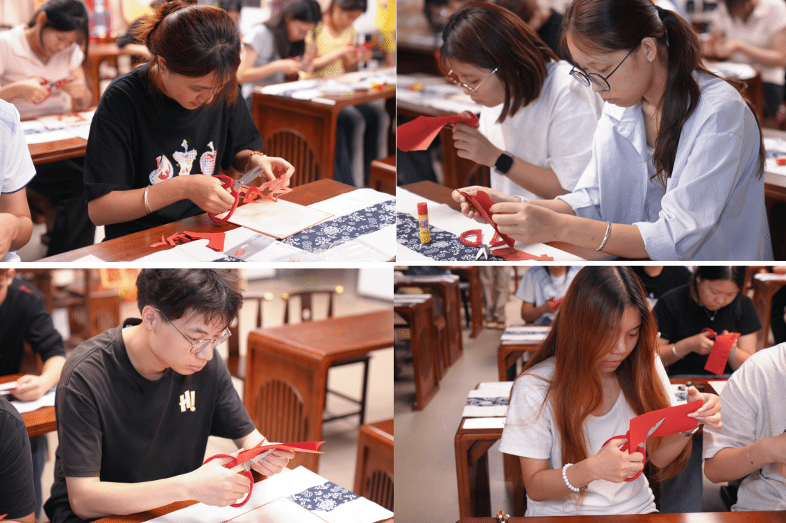 在实践创作环节,同学们以红纸为材,提取团花等民族符号,耐心完成构图、折叠、剪裁、镂空等步骤,让一幅幅吉祥寓意的剪纸作品跃然纸上,既有民族特色,又彰显青春创意。大家相互展示作品、分享创作心得,现场氛围热烈温馨。