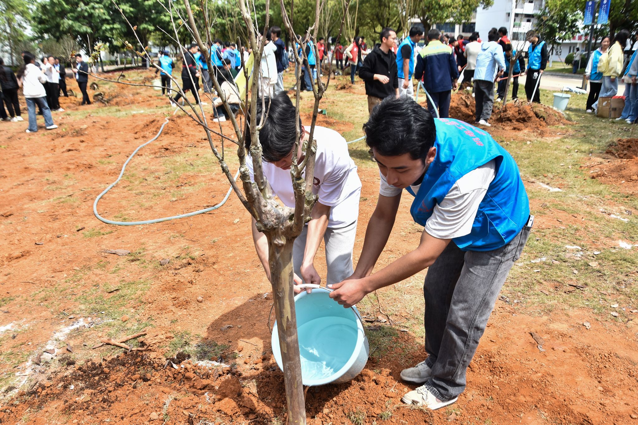 活动现场,师生们热情高涨、干劲十足,迅速投入到植树劳动中。大家分工明确、配合默契,有的挥锹铲土、挖坑定穴,有的扶苗培土、踩实固根,有的提桶浇水、养护新苗,每一个环节都严谨细致、有条不紊。在师生们的共同努力下,一排排新栽的树苗挺拔而立,错落有致地扎根校园沃土,为初春的校园增添了一抹生机勃勃的绿色。