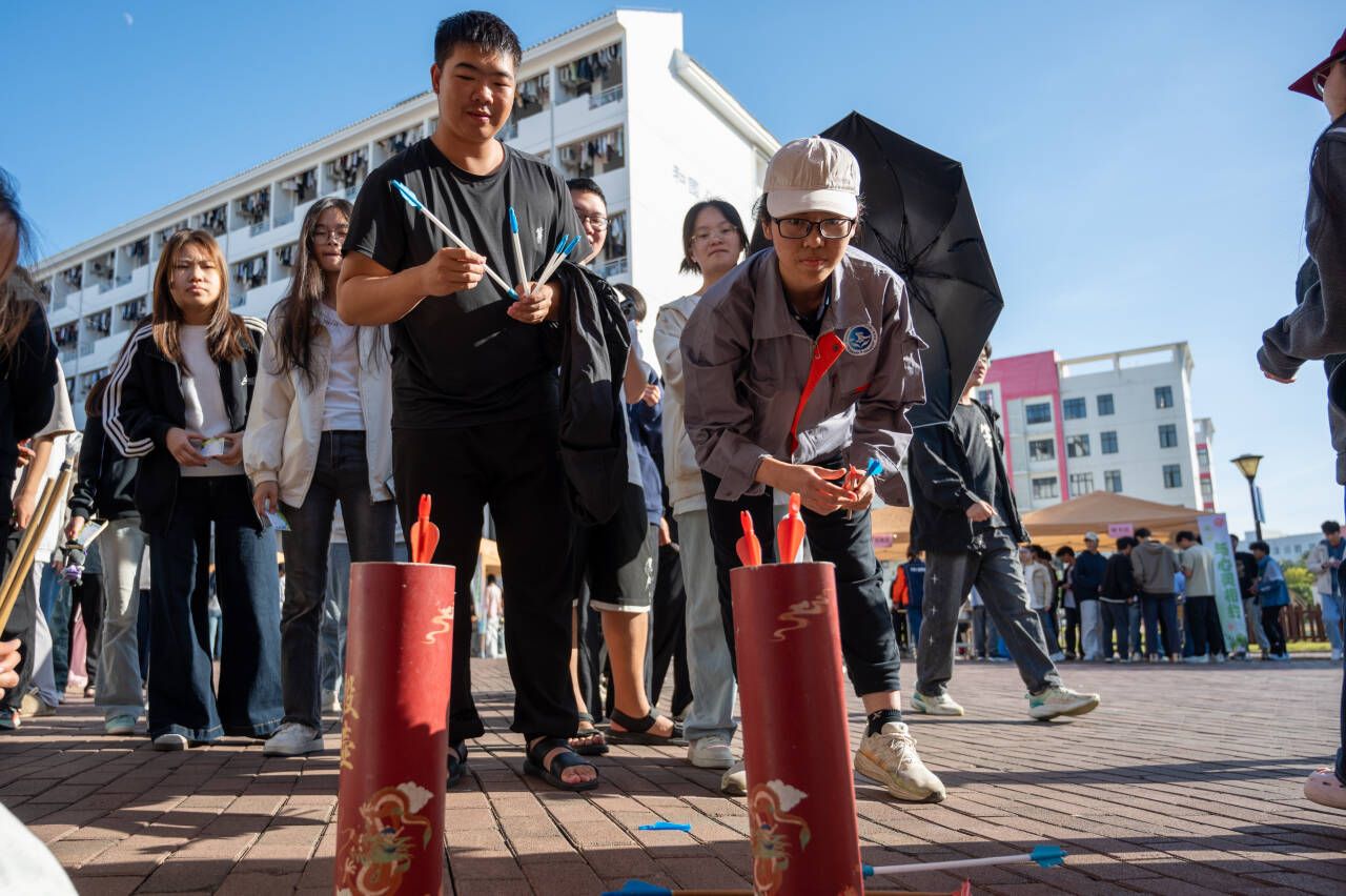 活动过程中,同学们积极参与各个游戏项目,现场欢声笑语不断。在“你比我猜”环节,搭档之间默契配合,生动有趣的表达引发阵阵掌声;乒乓接力项目中,小组成员通力合作,展现出良好的团队协作精神;投壶区域气氛专注,同学们在体验传统游戏的过程中感受文化魅力;“两人三足”与“蒙眼踏步”项目既充满趣味又考验信任,参与者在互助中增进情感;益智大挑战则吸引了善于思考的学生,大家在动手动脑中提升逻辑思维能力。