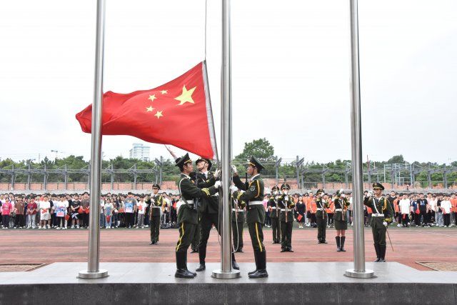 上午7时30分,主持人宣布举行升国旗仪式,学校国旗队护送国旗入场,鲜艳的五星红旗伴随着庄严的《义勇军进行曲》徐徐升起、迎风飘扬,在场师生肃穆而立,唱国歌,行注目礼。
