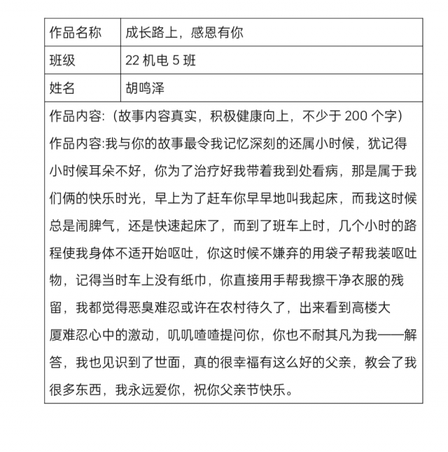 [本网讯]为推动机电工程学院“感恩-创新”的文化品牌内涵建设,树立“感恩父亲,弘扬美德”的良好风尚,引导学生感受父亲的伟大和无私,学会感谢父亲、感激生命、感恩生活。6月8日—19日机电工程学院心理工作站以父亲节为契机,面向全院师生开展了感恩教育活动,鼓励师生勇敢表达感恩之情。此次活动由机电工程学院心理站站长李莹莹老师策划,机电工程学院心理部协助开展,活动在师生中反响热烈。