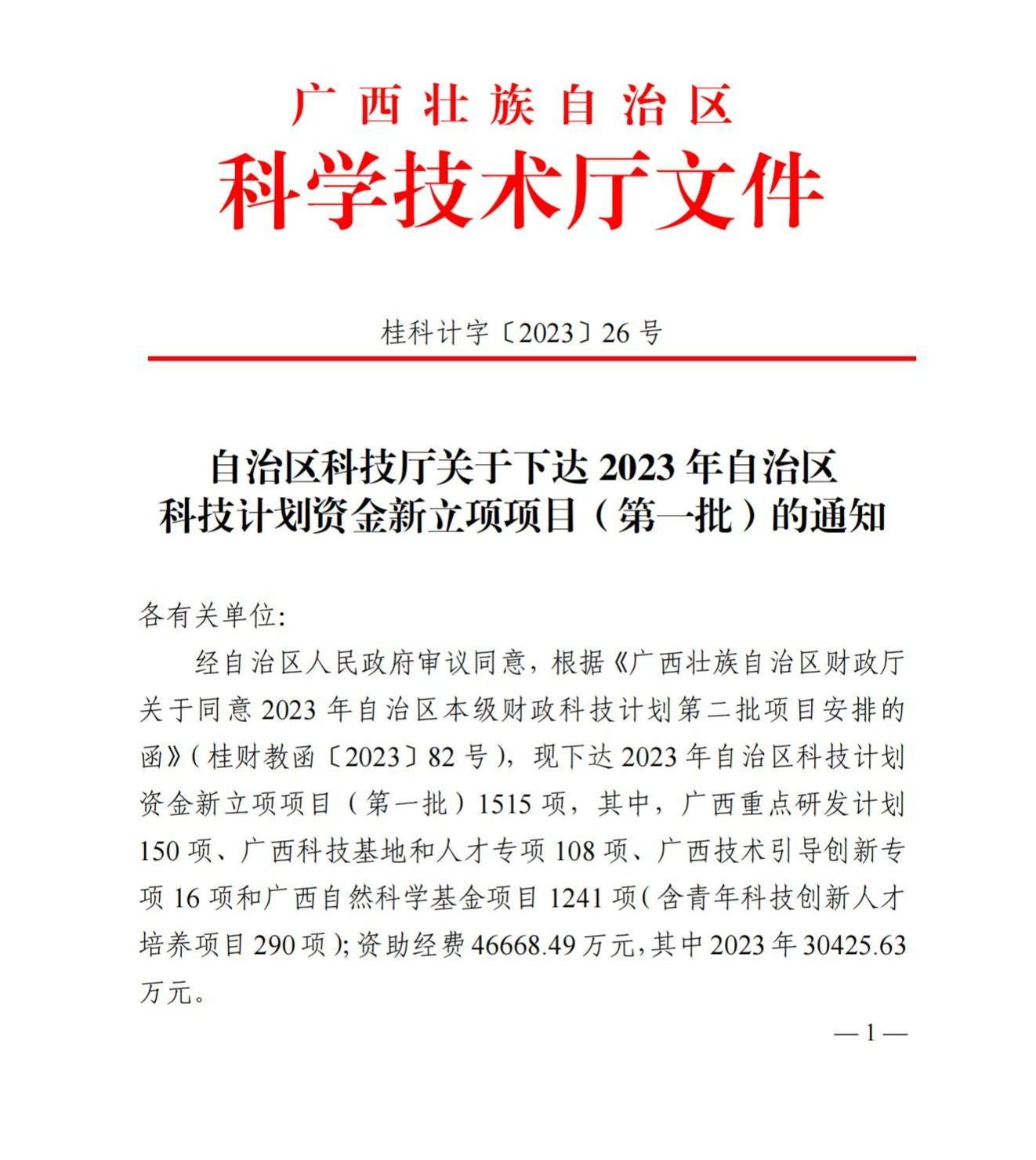 桂科计字〔2023〕26号自治区科技厅立项通知_《考虑水体附加质量效应的水泵水轮机动力特性及运行稳定性分析》何玲艳