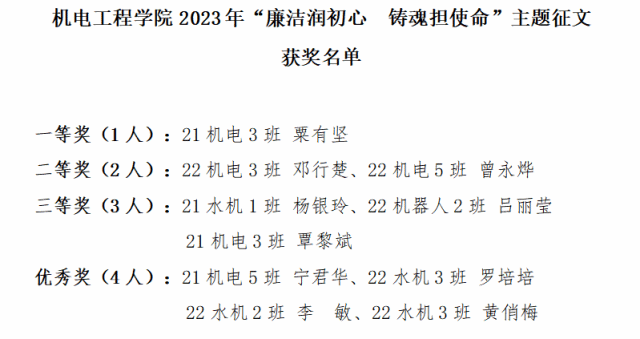 本次比赛以“廉洁润初心,铸魂担使命”为主题,征文作品体裁以诗歌、散文、随笔、信件等为主,作品内容主要突出廉洁教风、廉洁学风和廉洁家风精神,活动发出后,共收到作品30余份。经过评委老师的认真评定,21机电3班粟有坚同学获得一等奖,22机电3班邓行楚、22机电5班曾永烨获得二等奖,21水机1班杨银玲等3位同学获得三等奖,21机电5班宁君华等4位同学获得优秀奖。