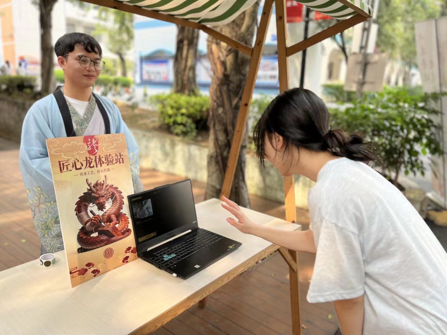 本次活动以“七条主题龙对应七种AI技术”为核心特色,精心设置体感舞龙体验区、VR眼镜体验区等板块。活动现场氛围热烈有序,同学们纷纷驻足打卡,深入了解AI技术与炮龙非遗文化的融合应用,通过体感操控虚拟炮龙、VR沉浸式感受炮龙节热闹场景,在互动体验中深化对非遗文化的认知,展现了学生们积极向上的良好风貌,学院工作人员全程做好服务保障,确保活动顺利开展。