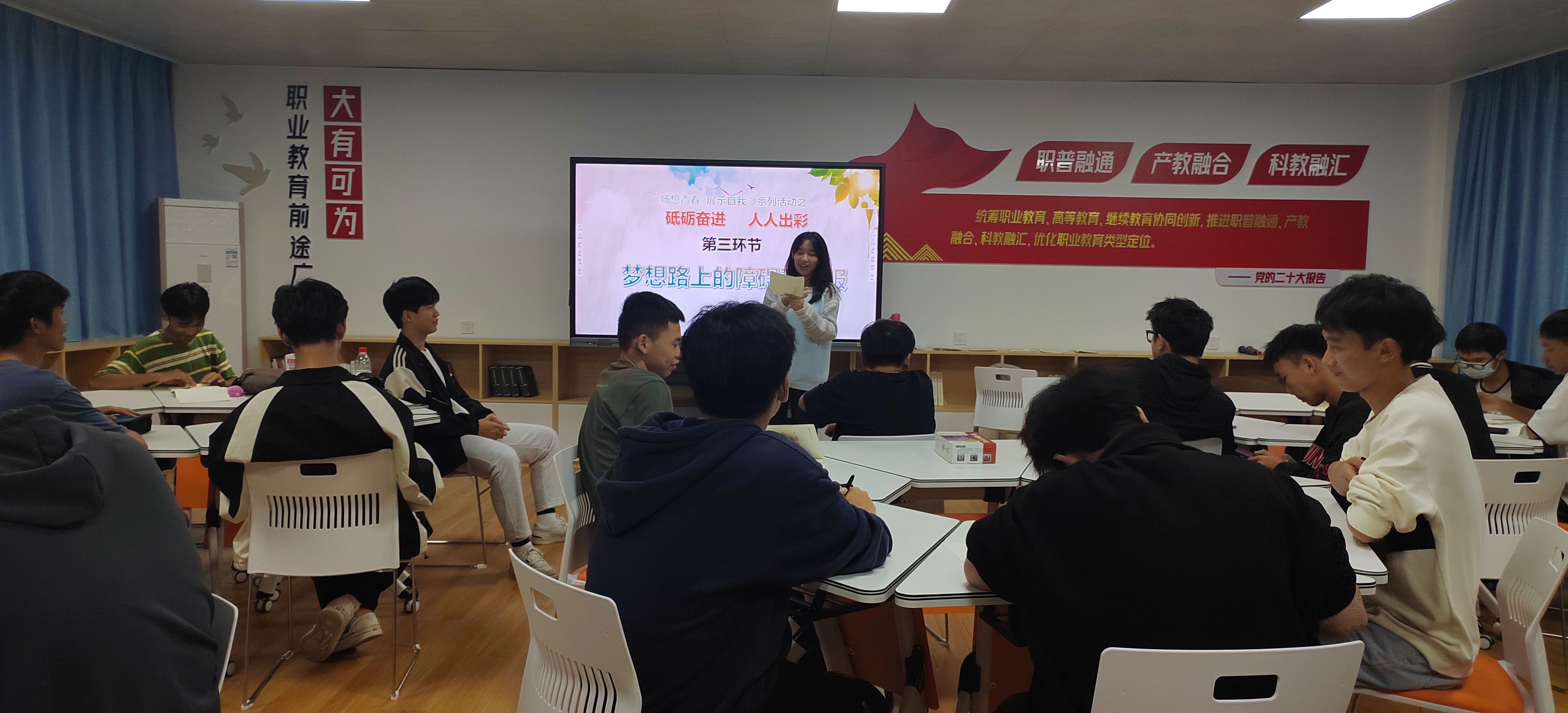 本次活动是“畅想青春 展示自我”系列活动之一,分三个环节进行。首先,通过播放短片让同学们深刻认识到在全面建设社会主义现代化国家新征程中,职业教育前途广阔、大有可为;其次,同学们进行了音乐、演讲等特长展示,并结合特长或专业讲述了自己的青春梦想;最后是互问互答环节,每位同学结合自身现状认真思考,写出梦想实现路上的最大障碍,同时选择其他一位同学的困难给予切实可行的建议,教师作补充引导。