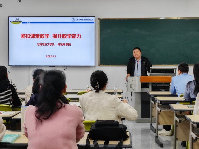 广西经济职业学院马克思主义学院肖馆院长介绍了本校思政课教师队伍的基本情况,思政课程建设方面的情况,以及提升教师教学能力的做法。我院冉海涛教授作了《紧扣课堂教学 提升教学能力》的专题讲座,围绕“如何对待课堂教学”“如何对待比赛”“真正的以赛促教,提升自我”三个方面,进行了深入浅出的分析。张从磊老师进行了《“精彩一课”经验交流》的分享,向全场的老师展示了他参加“精彩一课”的参赛作品,并对教学设计、教学过程、教学总结进行了全面的剖析,既有深度又有广度。最后是自由交流环节,两校思政课教师围绕“以赛促教,提升自我”展开交流,对课堂教学和教学比赛的相互促进、协调安排等方面进行了热烈的交流讨论。