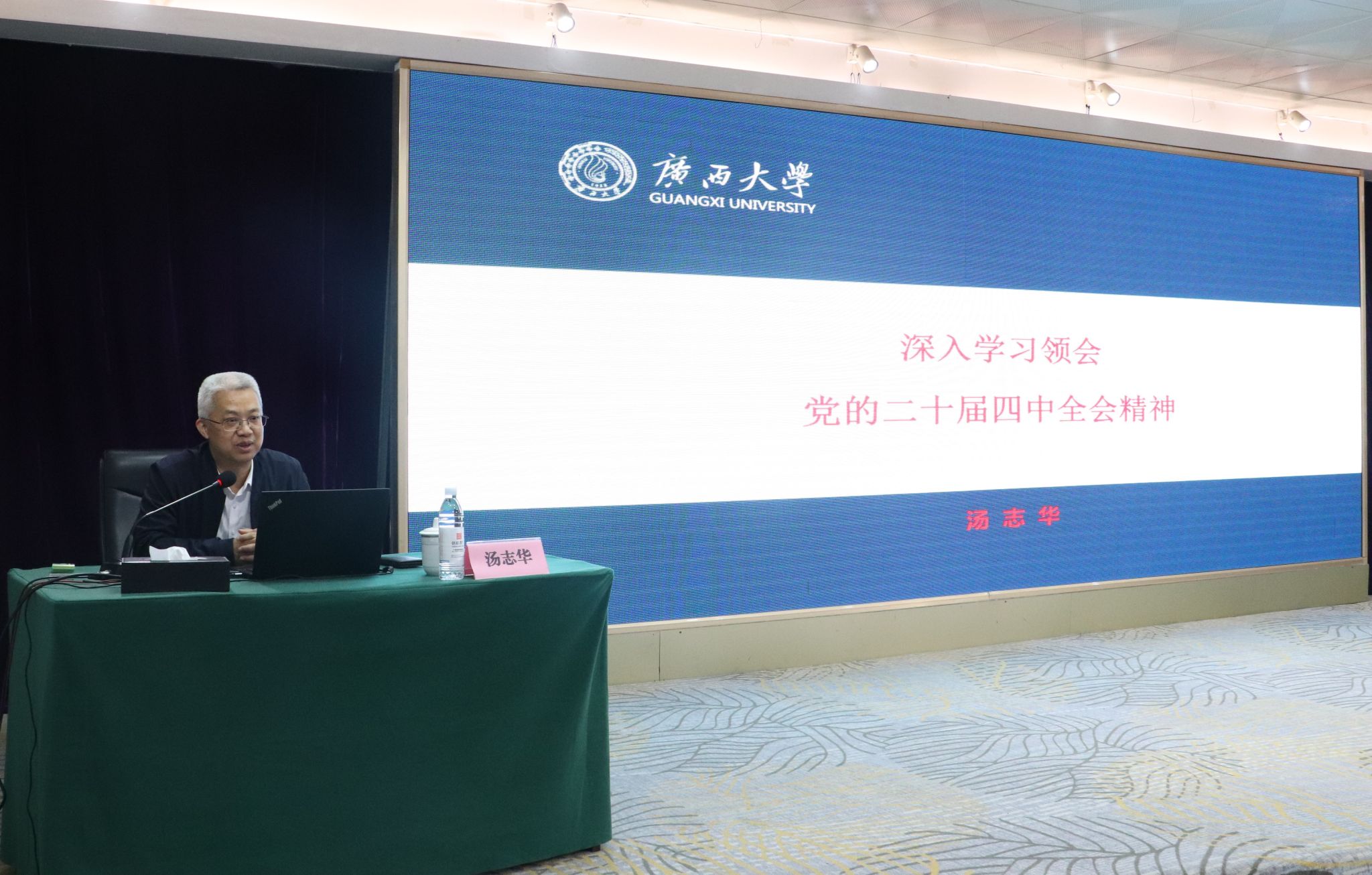 [本网讯]为深入学习贯彻党的二十届四中全会精神,扎实推动全会精神进教材、进课堂、进头脑,落实立德树人根本任务,持续推进大中小学思政课一体化建设,全面提升育人实效,11月28日,学校马克思主义学院牵头组织“深入学习领会党的二十届四中全会精神”专题讲座。广西大学党委副书记汤志华教授应邀担任主讲专家。