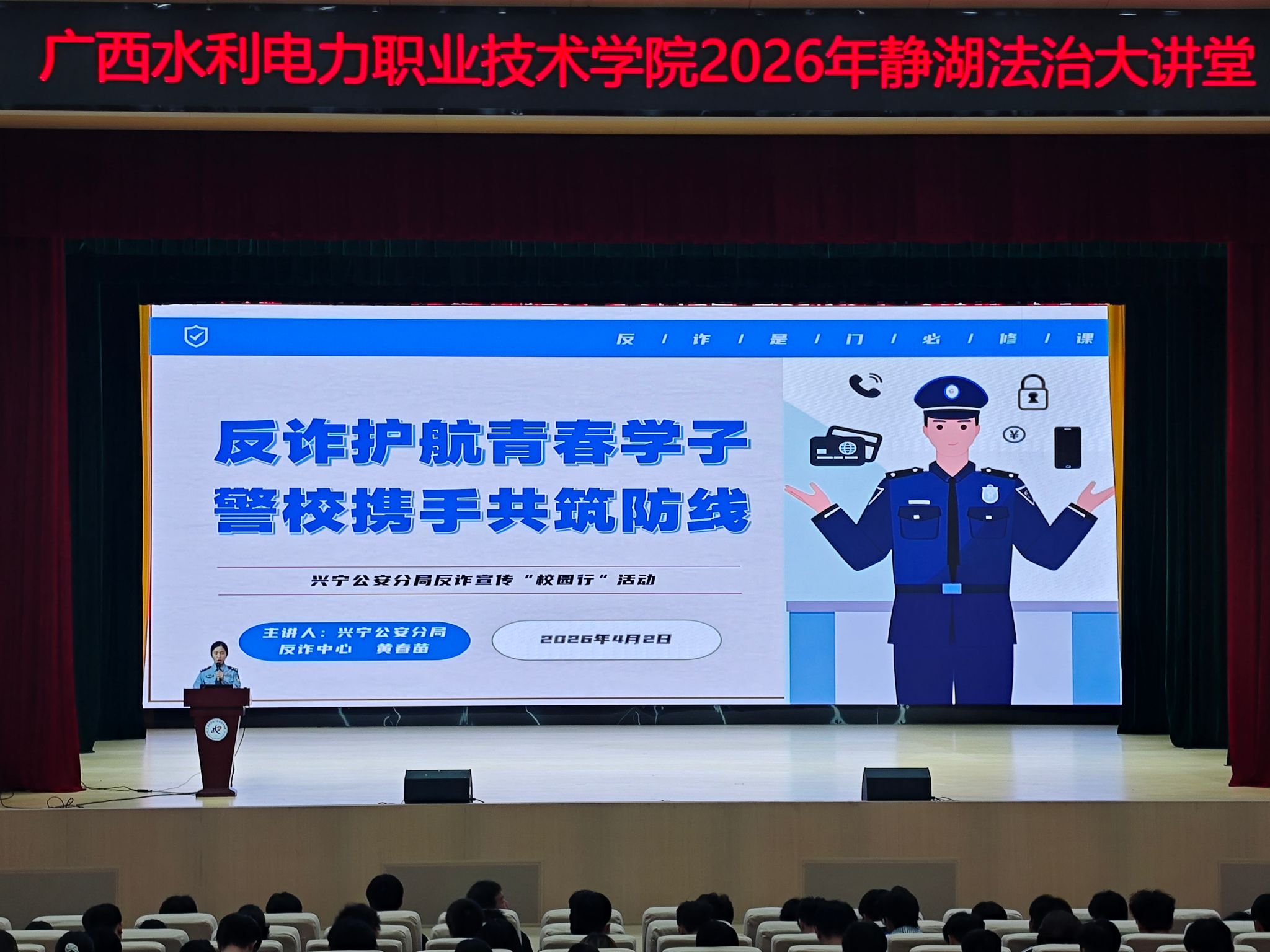 [本网讯]4月2日晚,我校春季学期第二场反诈防骗专题讲座在长堽校区校友楼礼堂开讲,经管学院和信息学院师生代表720余人参加。此次讲座,由南宁市公安局兴宁分局反诈侦查中心专员黄春苗担任主讲。黄警官结合近期高校发生的真实案例,针对AI换脸冒充熟人、兼职刷单返利...