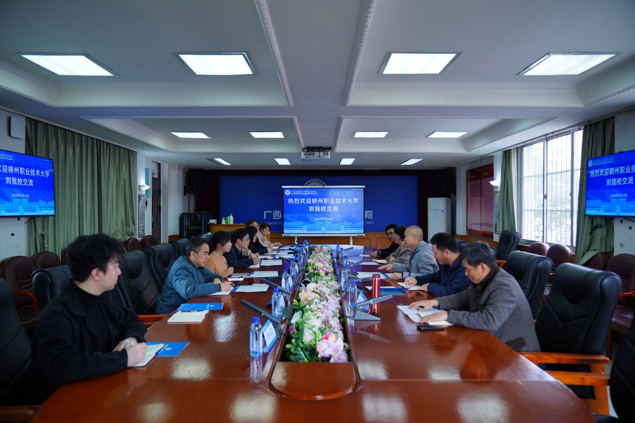 [本网讯]2026年1月14日下午,柳州职业技术大学审计处副处长(主持工作)周继春率后勤基建处、国有资产管理处、财务处一行5人到访我校开展交流活动。我校后勤管理处(保卫处)处长余娜、基建处处长黄飞华、资产管理中心主任莫年发、审计室主任刘中宽、财务处副处长黄莹等热情接待。