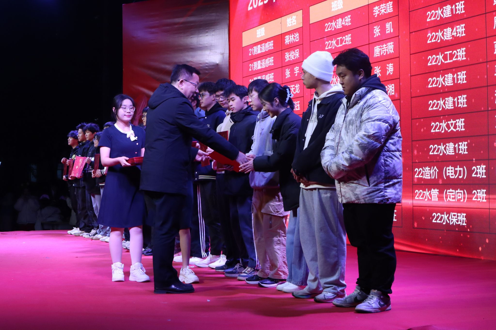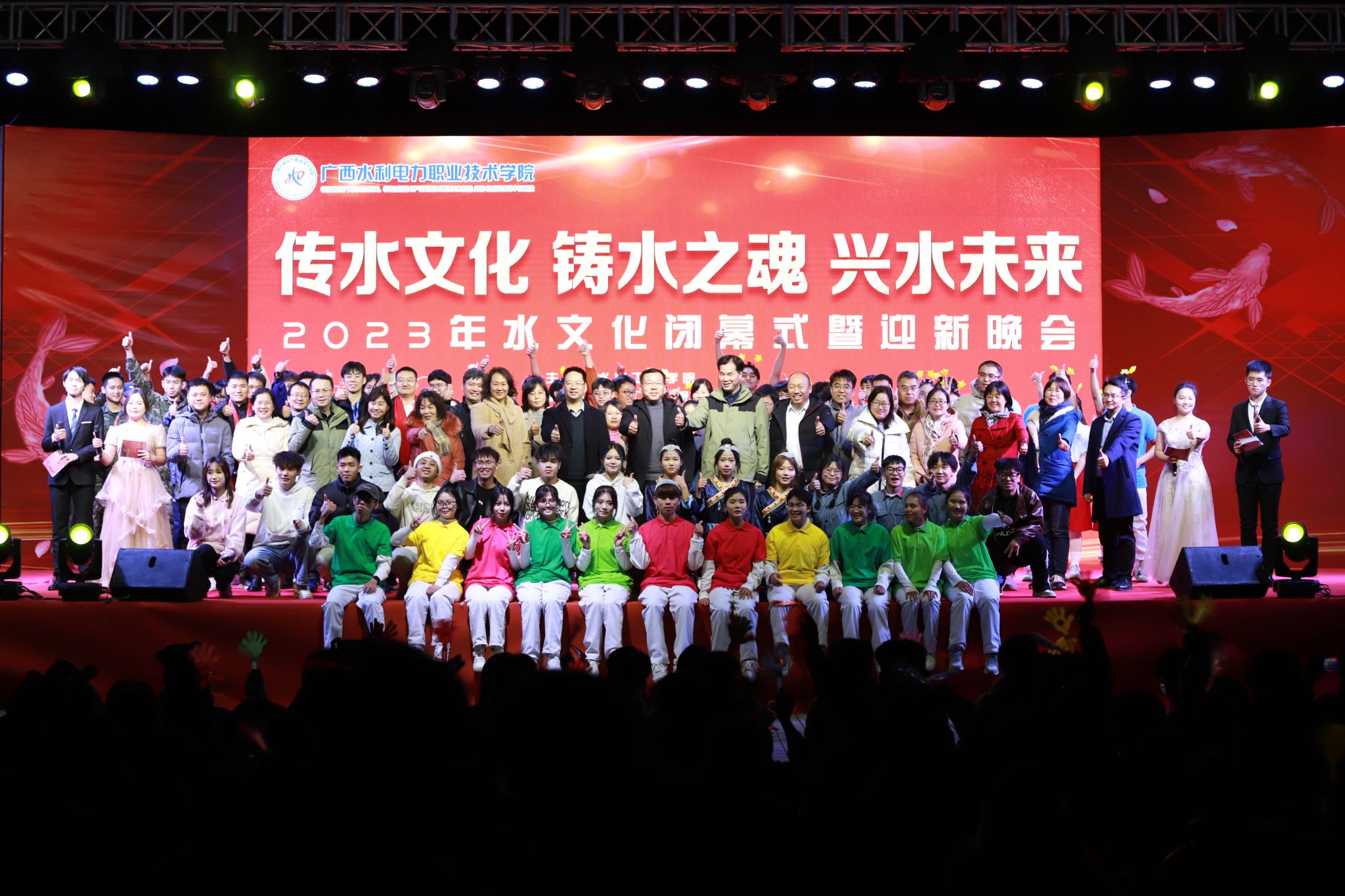 晚会的一大亮点是通过“水文化”系列活动回顾串联的方式,生动展现了2023年校园水文化的丰富内涵。主持人围绕水知识开展现场有奖竞答,现场气氛不断高涨。李林校长、周涛副校长、虞松宾总经理分别为2023年“水文化”系列活动中获奖的153名代表颁奖,余金凤院长为广西宏源水利电力勘察设计有限公司颁发了“情系职业教育优秀企业”锦旗。晚会在各位老师的多种语言祝福中推向高潮,晚会圆满结束。