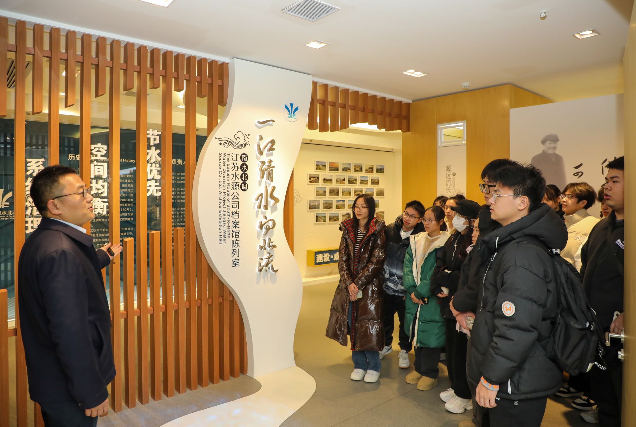 参观过程中,同学们在讲解员的带领下,先后参观了南水北调东线江苏水源有限责任公司水情教育室、科普教育区、档案馆陈列室等展厅。通过先进的展陈设施、深厚的文化底蕴,详细了解了南水北调东线工程建设过程和高质量发展历程,认识国家水网的主骨架与大动脉,增强同学们身为水利学子的自豪感。