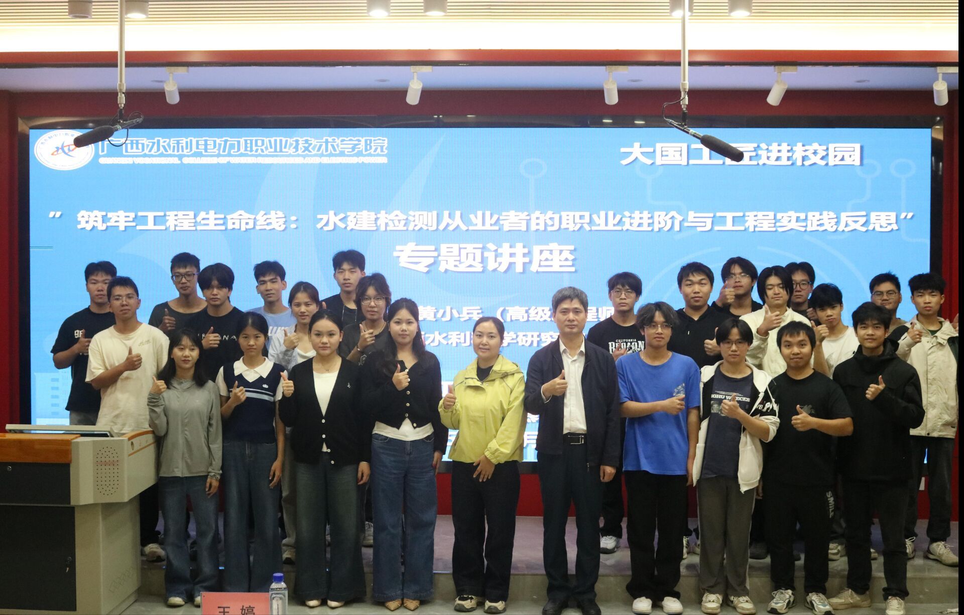 [本网讯]11月14日,水利工程学院在里建校区1教阶梯301举办“大国工匠进校园——筑牢水利工程生命线:水建检测从业者的职业进阶与工程实践反思”专题讲座。本次活动特邀广西水利科学研究院高级工程师黄小兵作为主讲嘉宾,专任教师、辅导员代表及2024级水建专业同学参与讲座。讲座由余金凤名师工作室、王卓然博士工作室、刘德财博士工作室、“慕水”辅导员工作室联合承办。