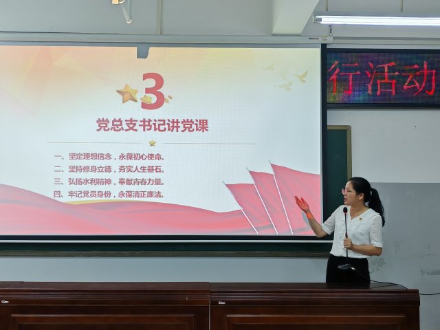 班兰美书记以“不忘来时路,奋进新征程”为题为毕业生党员上“最后一堂党课”。班书记带领大家追忆入党初心谈感受,要求毕业生牢记自己的党员身份,强化党员意识,在今后的学习和工作中深刻把握习近平新时代中国特色社会主义思想的世界观和方法论。并对毕业生党员提出了四点希望:一是坚定理想信念,永葆初心使命,从党的奋斗历程中汲取前进力量,为水利事业奉献自己;二是坚持修身立德,夯实人生基石,要有终身学习的理念,转化学习成果,在工作岗位上发光发热;三是弘扬水利精神,奉献青春力量,厚植家国情怀,以奋斗姿态激扬青春;四是牢记党员身份,永葆清正廉洁,保持高度的组织纪律性,做到不褪色不变色,不锈蚀不腐化。