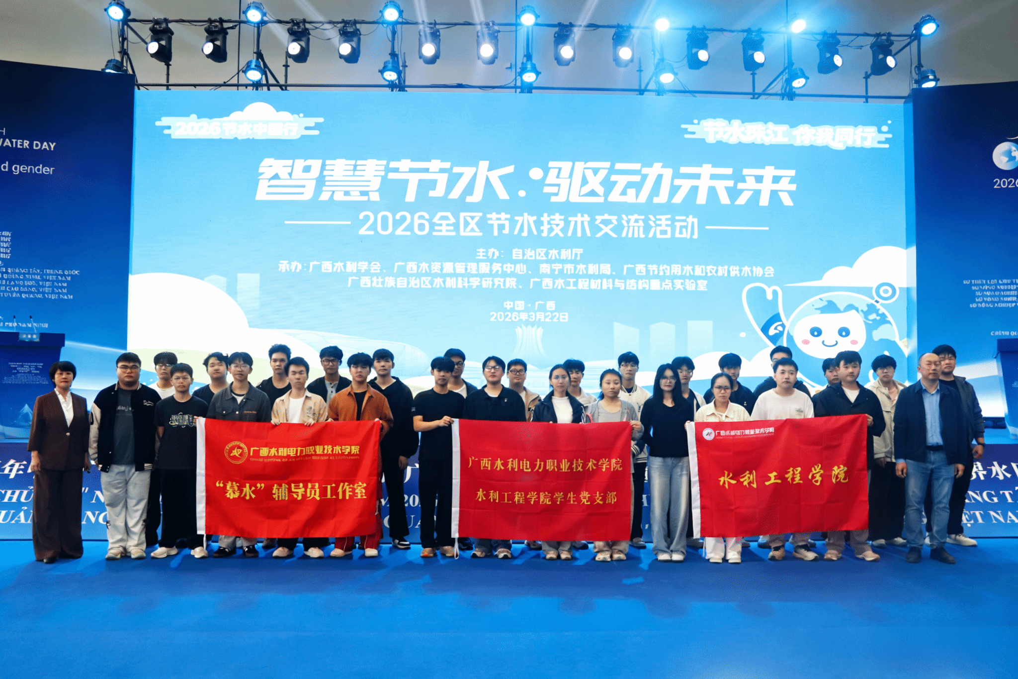[本网讯]3月22日,全区节水技术交流活动在南宁国际会展中心举办。水利工程学院党总支率学生党支部、“慕水”辅导员工作室师生代表到场参会,以实景研学夯实专业基础,厚植节水理念,强化使命担当。