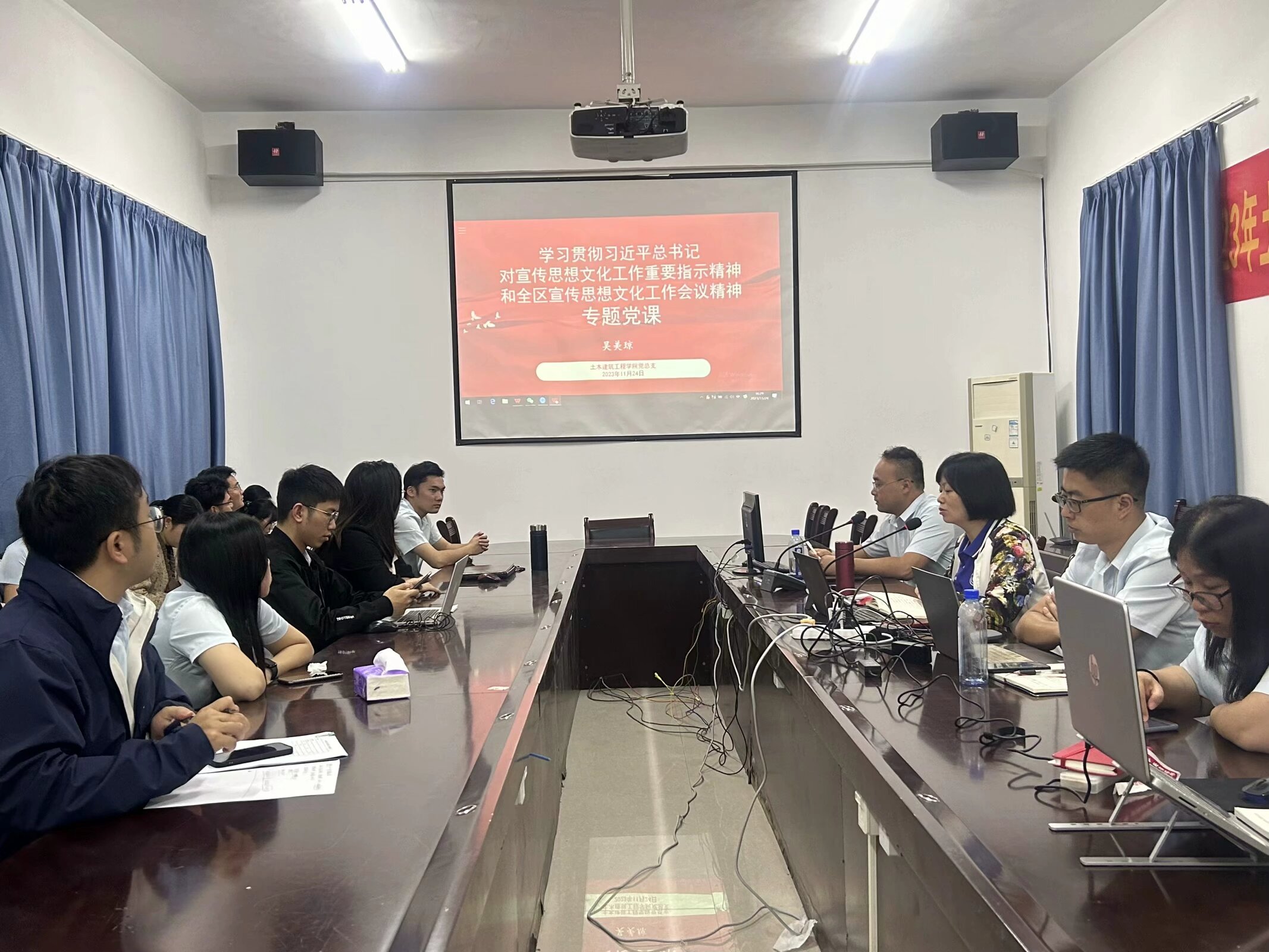 [本网讯]为深入学习贯彻习近平总书记对宣传思想文化工作重要指示精神和全区宣传思想文化工作会议精神,11月24日下午,土木建筑工程学院党总支在长堽校区电力实训楼七楼会议室开展专题党课学习,总支委、院长吴美琼主讲,全体党员教师参加。