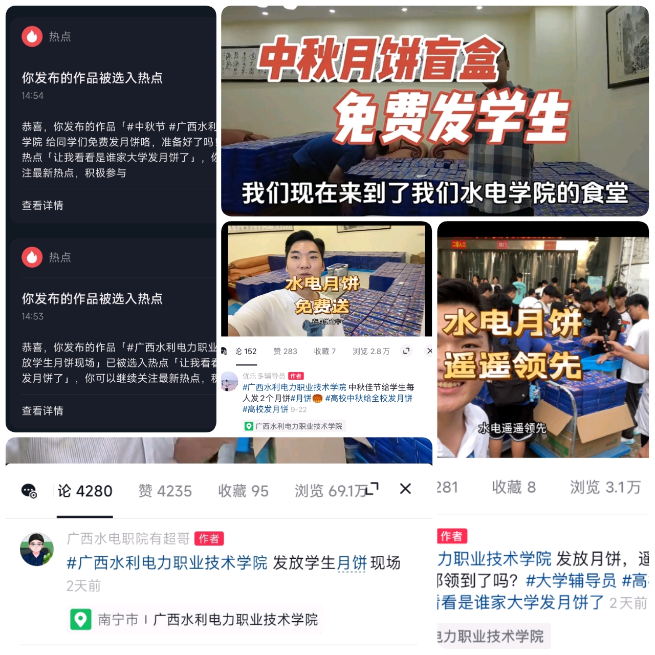 时值中秋和国庆“双节”前夕,学校精心为同学们准备的水电专属月饼,向全体在校学生共计发放月饼35000余枚。新媒体思政辅导员工作室为助力宣传好学校文化,打响水电品牌,紧跟学校动态,工作室成员在月饼制作、包装、发放过程中采集了大量视频素材,先后在抖音、B站、微信视频号发布短视频7条,累计播放量超过100万次,其中两条短视频进入抖音“热榜”,内容得到在校师生、广大校友和社会各界人士关注和点赞,宣传了我校对在校生成长的殷切关注。