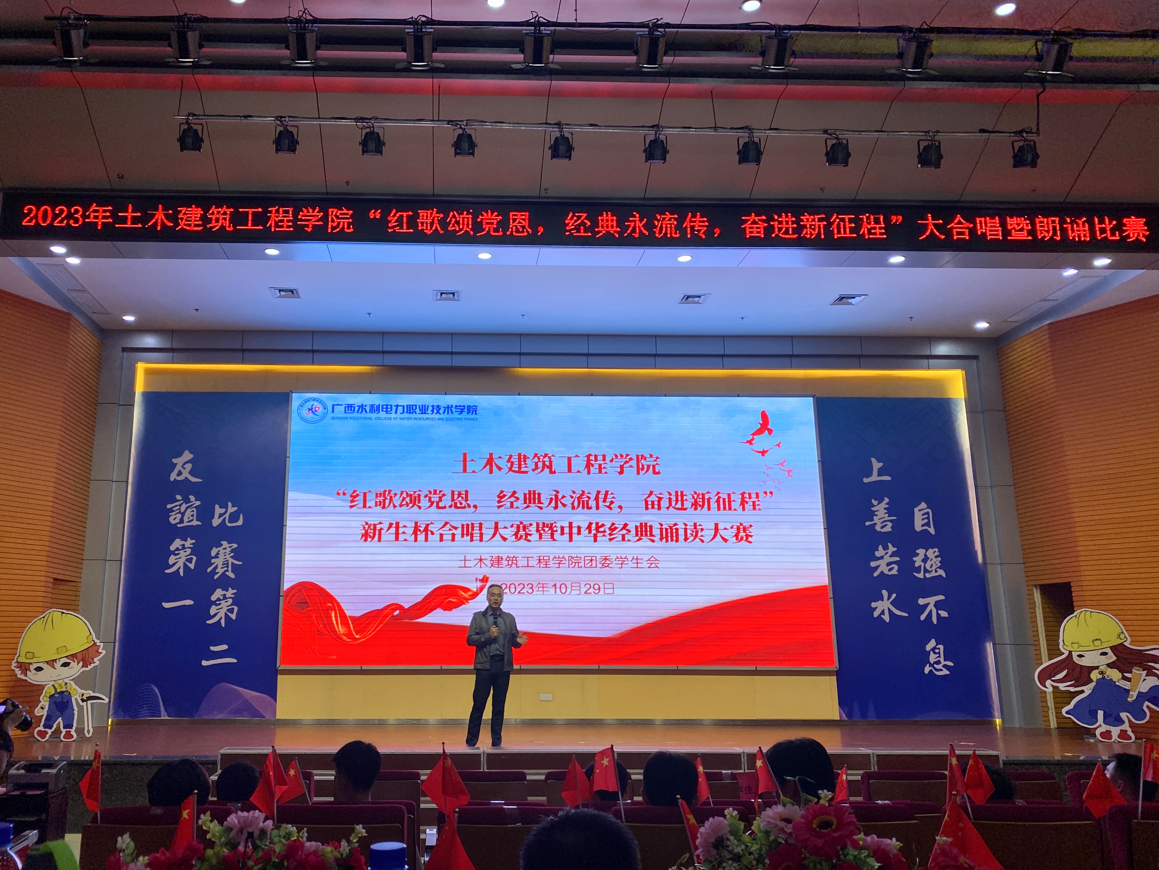 [本网讯]10月29日晚,土木建筑工程学院在里建校区青年之家报告厅举办红歌颂党恩,经典永流传,奋进新征程新生杯合唱大赛暨中华经典诵读大赛,土木建筑工程学院党总支书记梁中超、土木建筑工程学院辅导员代表以及2023级新生班级班主任出席活动,2023级全体同学参与并观看本次大赛
