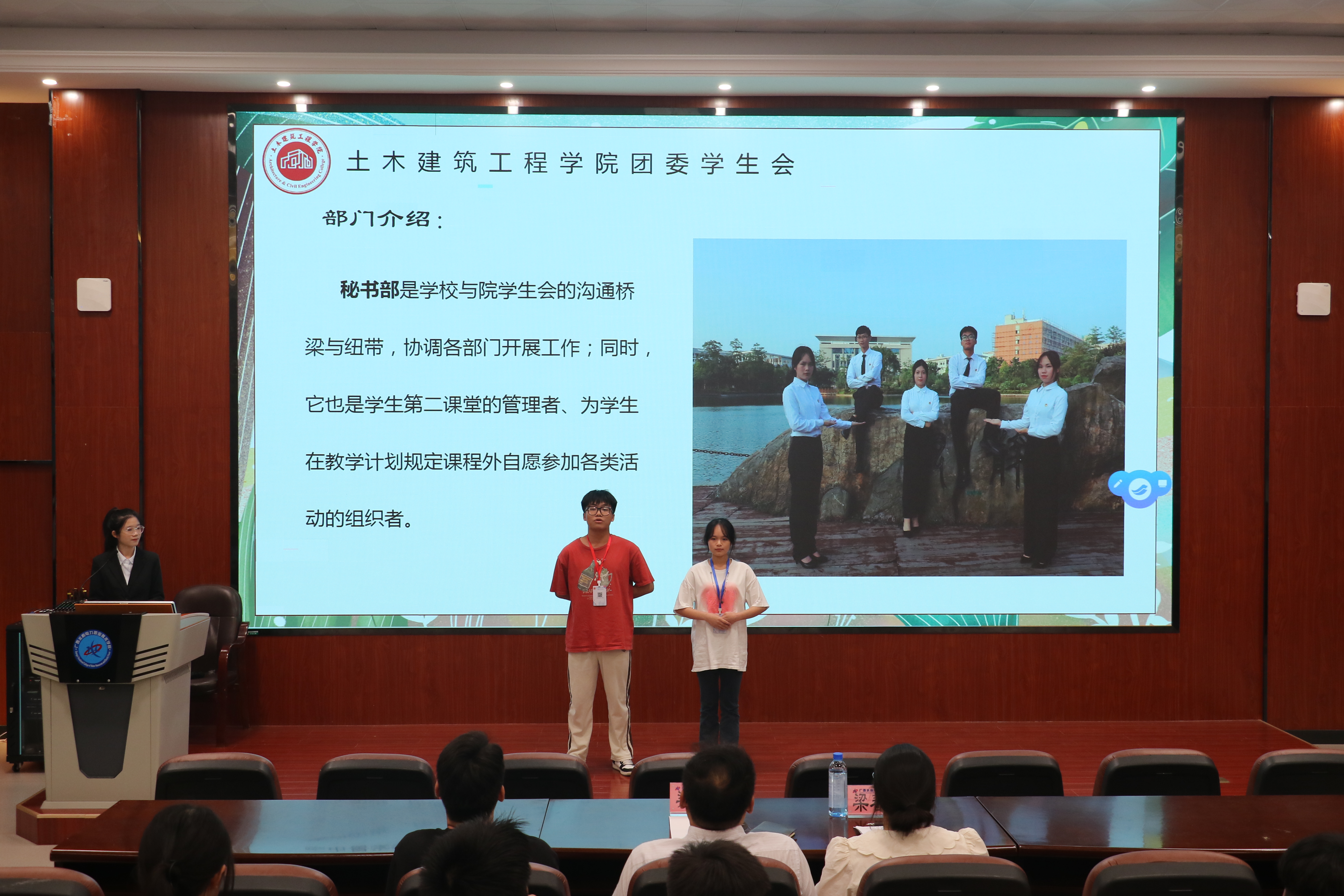 会议开始,首先由各部门2022级成员依次上台自我介绍,并介绍部门职责,帮助2023级各部门成员对学院团委学生会的工作有更深入了解和认识。会上,梁春艳老师对2023级新干事表示热烈欢迎,也希望各位学生干部们在接下来的实际工作中能够脚踏实地,努力提高自身工作能力,为学院贡献自己的青春力量!