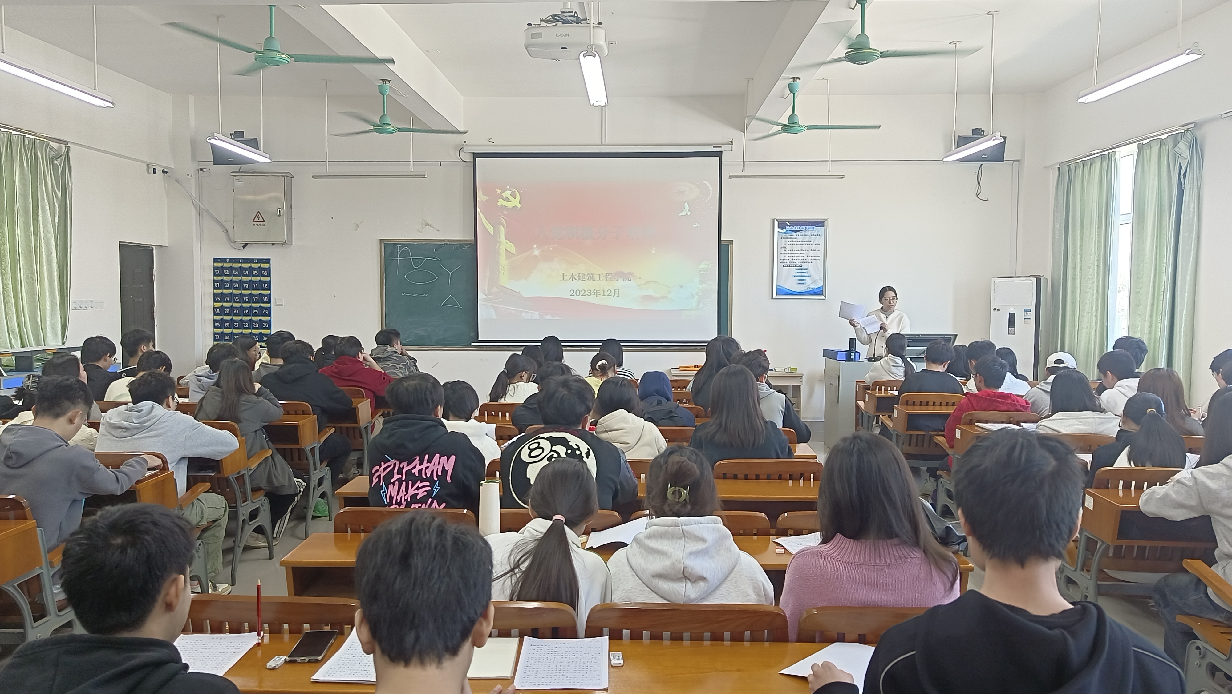 [本网讯]为严格把好发展党员“入口关”,提高入党积极分子的思想意识和党性修养,切实提升党员发展的质量,土木建筑工程学院于2023年12月7日中午,在建筑实训楼402开展了2023年入党积极分子培训。本次培训由黄明媚老师主持,94名入党积极分子参加。