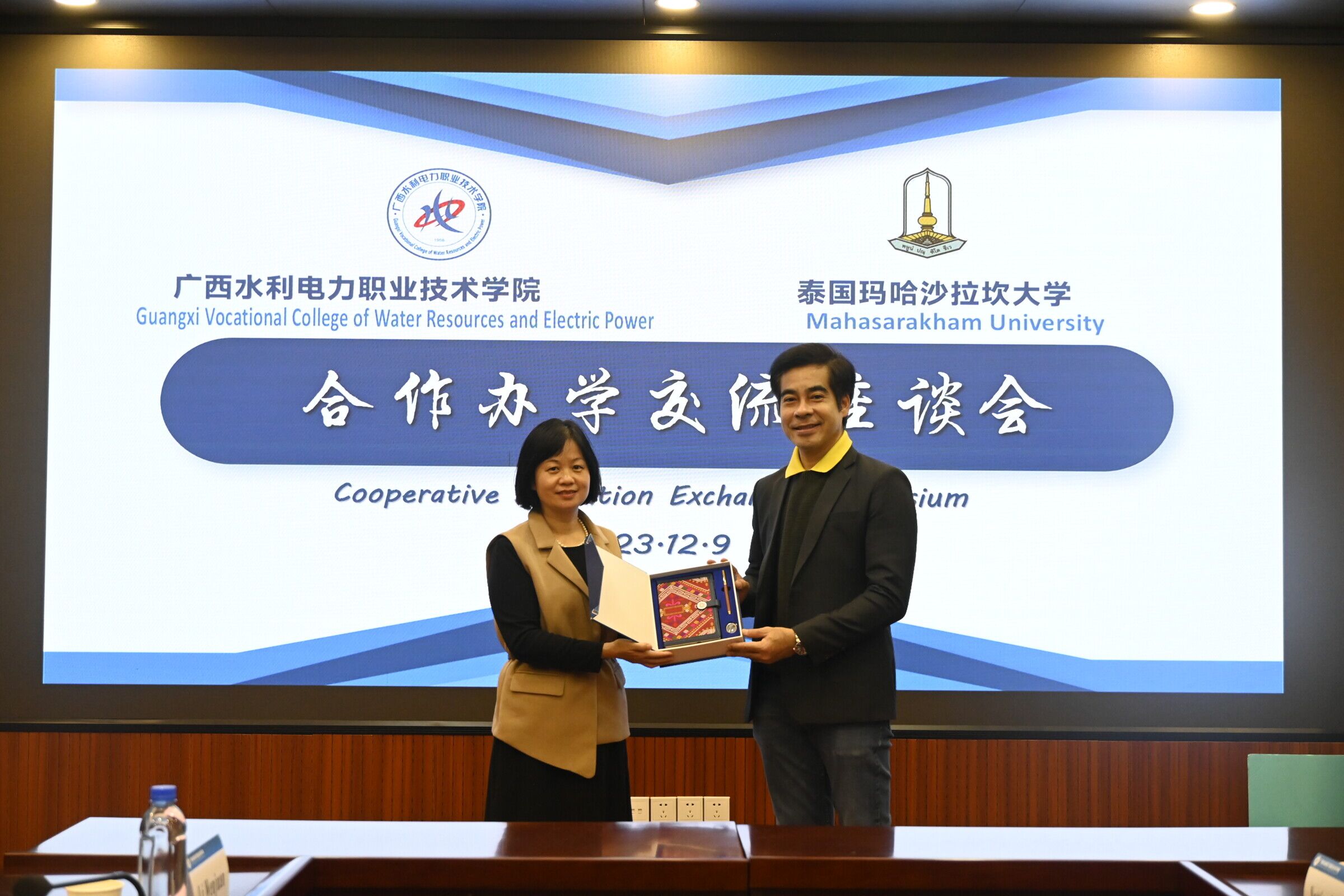 随后,双方围绕人才培养、科学研究、国际交流合作等展开了深入的交流与讨论,达成合作初步意向。会上,吴美琼代表学校赠送了富有广西民族文化特色的纪念品,表达我校对泰国玛哈沙拉坎大学友好往来的期望和美好祝愿。