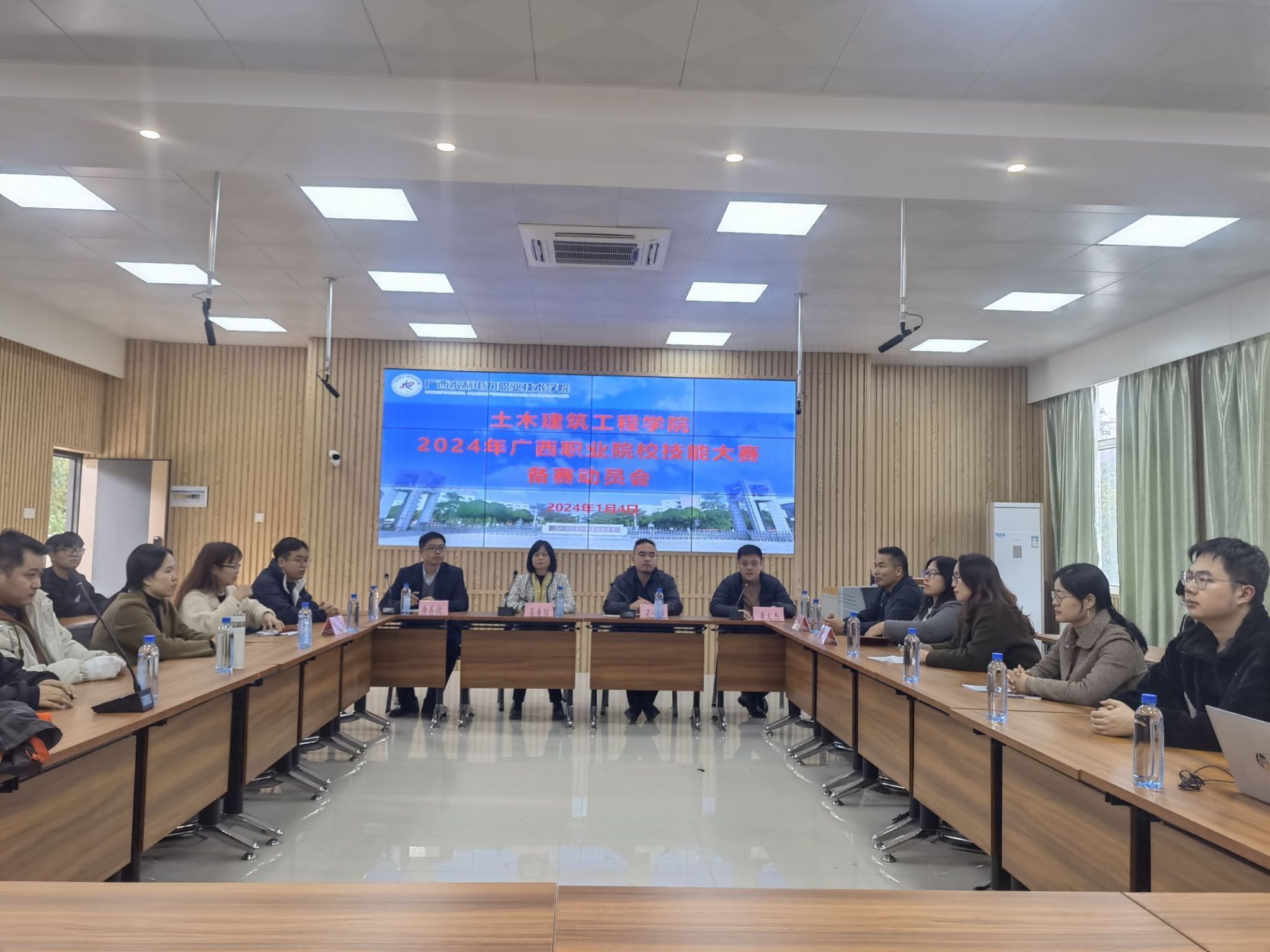[本网讯]为了更好地备战2024年学生技能竞赛,1月4日下午,土木建筑工程学院在里建校区建筑实训楼202教室召开2024年学生技能竞赛动员会。土木建筑工程学院院长吴美琼、党总支书记梁中超、副院长黄文杰、唐善德出席,学院教学团队负责人、专业负责人、2024年技能大赛参赛预备队队员及指导教师参加此次会议。