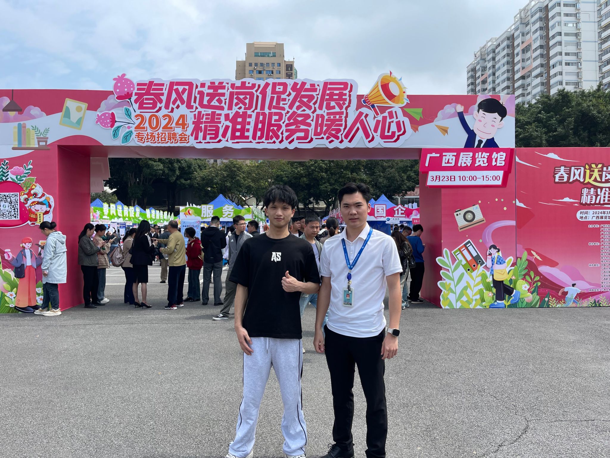 [本网讯]为促进2024届毕业生踊跃投身就业市场,紧抓春季招聘关键时期,3月23日,广西2024年“春风送岗促发展,精准服务暖人心”专场招聘会在广西展览馆举行。“大拇哥”网络思政辅导员工作室以招聘会为契机,通过“线下+线上”的方式多维度做好“逐梦未来”百期网络主题活动。工作室成员陈昌世老师到招聘会现场精准帮扶土木建筑工程学院未就业学生。