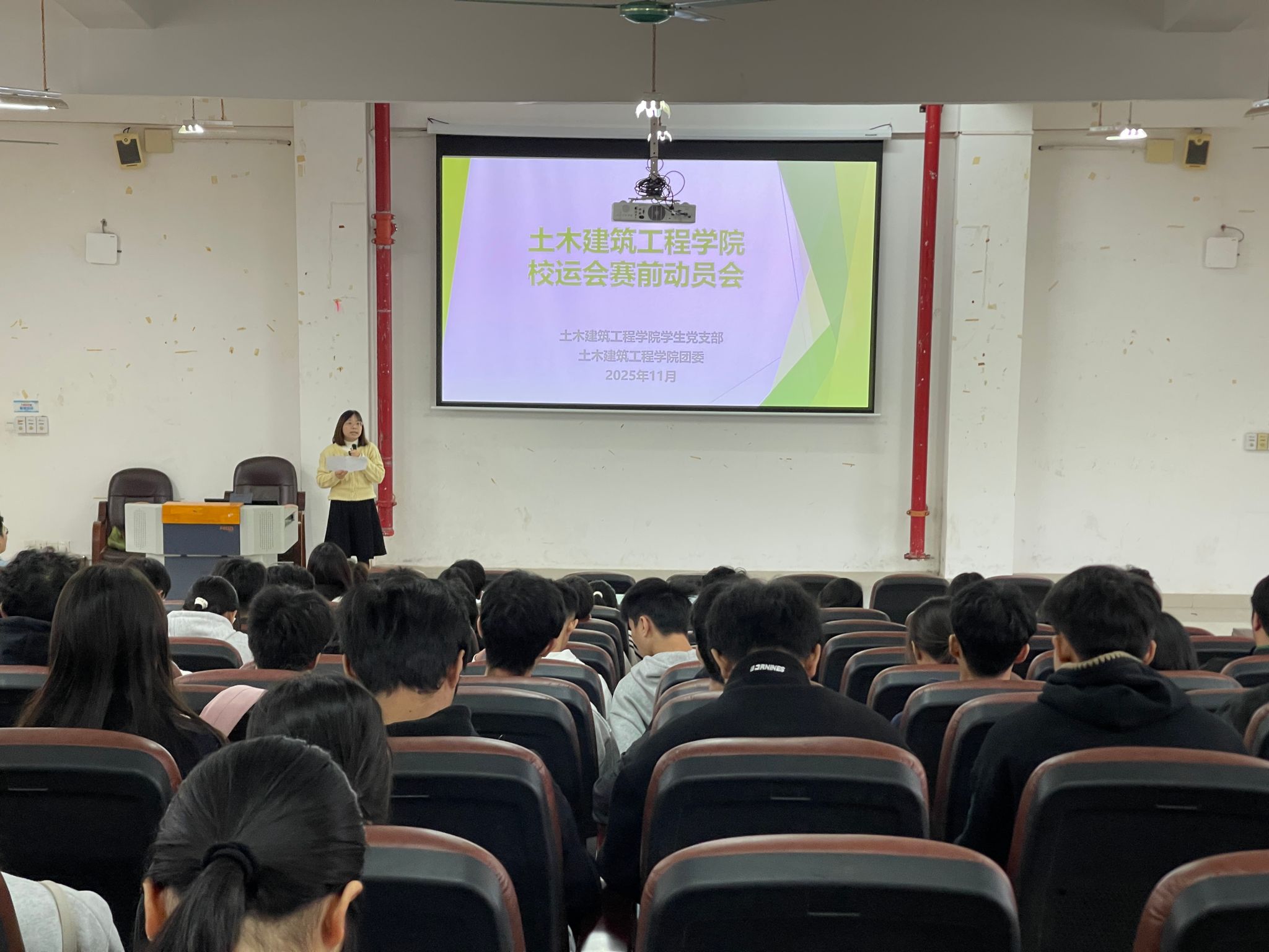 为凝聚学子斗志,做好校运会赛前筹备工作,11月4日中午,土木建筑工程学院学生党支部联合学院团委于里建校区一教报告厅召开校运会赛前动员大会。学生支部书记许月美、学院团委书记莫潇娉、各领队老师全体参赛运动员参会。