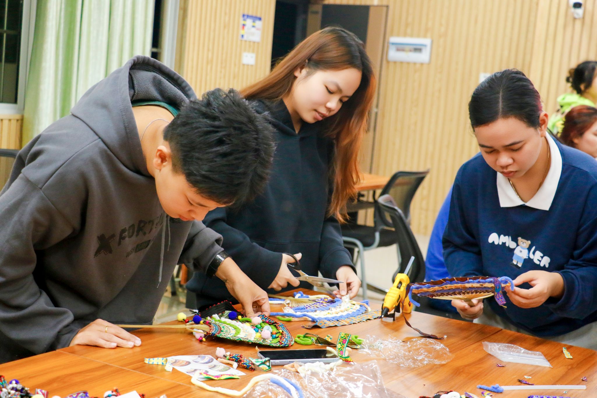 [本网讯]为彰显壮锦非遗文化魅力,深化中外文明交流互鉴,恰逢冬至佳节将至,12月11日晚,土木建筑工程学院于里建校区建筑实训楼202教室成功举办“壮锦流光非遗灿,文化互鉴冬至暖”主题留学生传统文化体验活动。活动由学院团委联合薪火辅导员工作室牵头组织,邀请电力工程学院30余名在校留学生沉浸式体验壮锦扇制作,让异国学子在指尖勾勒经纬、巧筑纹样的过程中,亲身感受中华优秀传统文化的深厚底蕴与温暖力量。学院院长助理李文娟、团委副书记梁春艳、薪火辅导员工作室覃荣坚、教师代表江柯燃出席活动,团委书记莫潇娉主持活动。