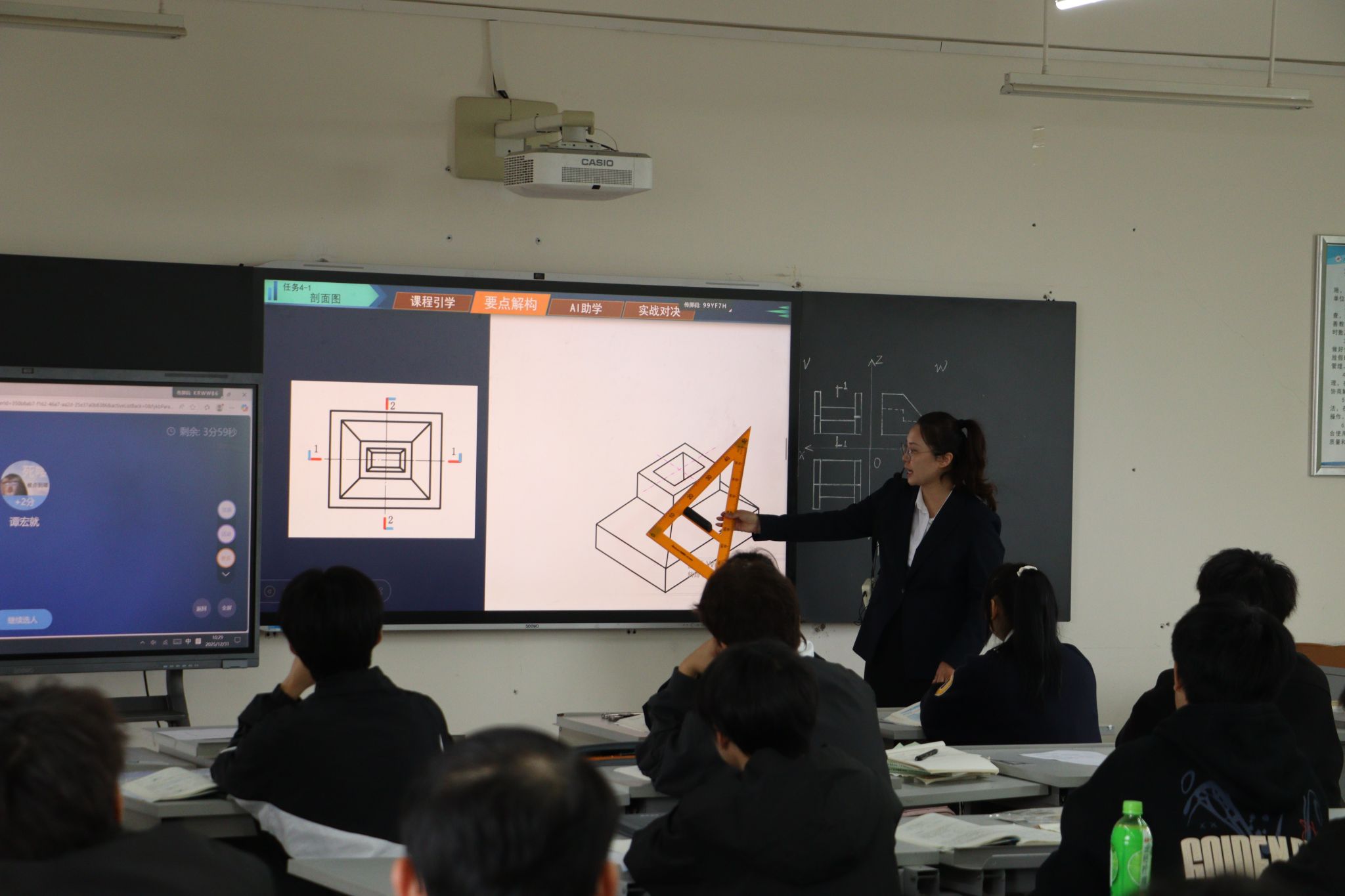 解双老师围绕“工程制图—认识与绘制剖面图”授课主题精心设计教学方案,以“课程引学-要点解构-AI助学-实战对决”为主线,构建了逻辑清晰、层层递进的教学环节。课程开篇,解老师通过工程实际问题精准衔接剖面图知识,随后结合制图规范将剖面图要点、绘制原则等核心内容拆解细化,讲解深入浅出、条理分明。在实战演练环节,解老师巧妙运用超星通AI助手,既丰富了学生三维空间想象力,又对学生制图作业精准诊断与点评,不仅有效突破传统教学的可视化难点,更显著提升作业反馈效率。整场课程课堂参与度与互动热情高涨,充分展现了理实一体化教学的独特魅力,为在场师生呈现了一堂高质量的专业示范课,课后在场师生给予了热烈掌声。