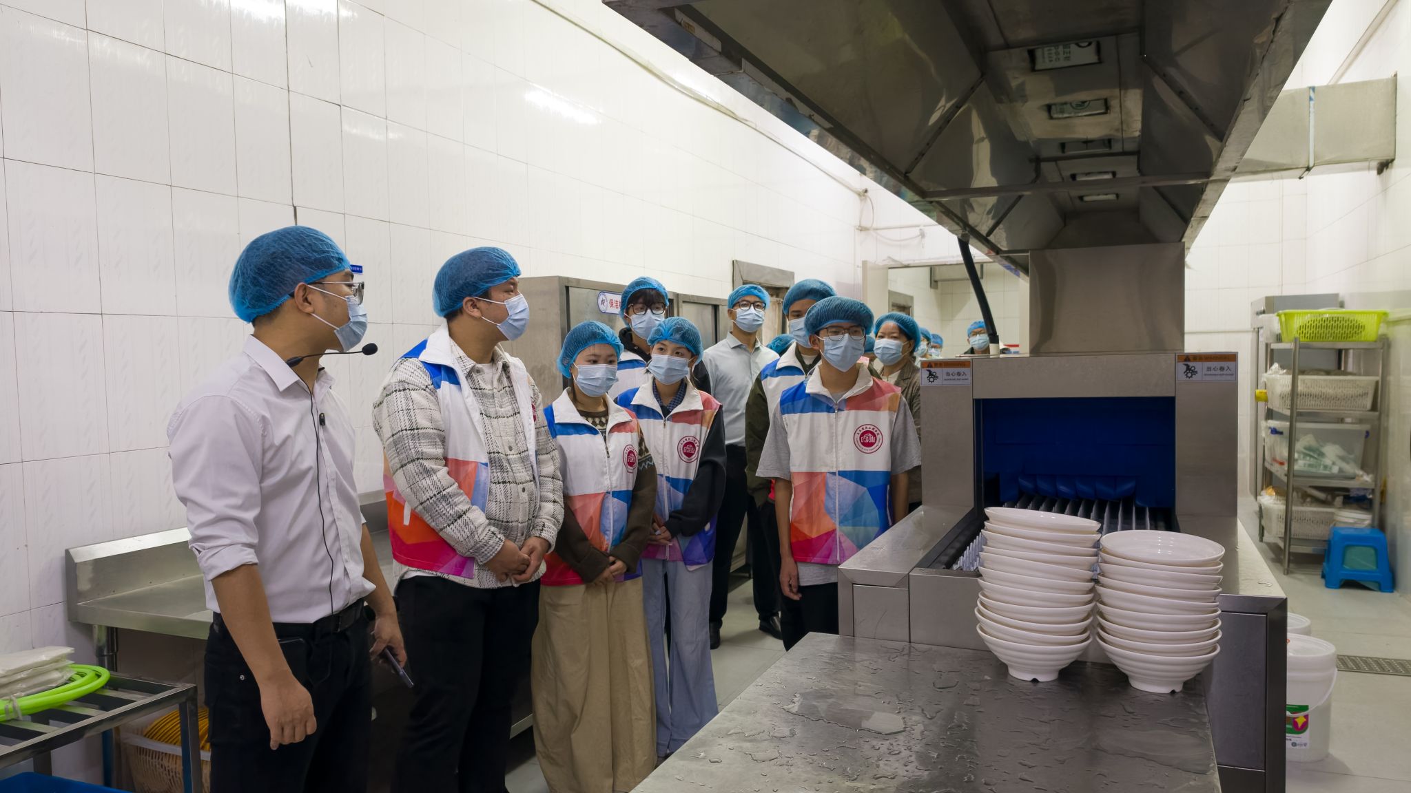 双方高度重视本次活动,土木建筑工程学院党总支副书记、院长唐善德带领10名师生代表参与,后勤管理处(保卫处)副处长韦素娟及5名后勤教师热情接待。活动伊始,食堂代表讲解后厨功能分区与操作规范,“劳动育人辅导员工作室”成员结合课程记录劳动技能要点;随后众人沿“食材流转动线”,参观存储区、切配区等关键区域,看到干货整齐码放、标签清晰,冷藏柜生熟分区。“大拇哥工作室”成员还就食材存储、餐具消毒等细节交流,同步记录亮点以备宣传。参观后,双方围绕“党建共建赋能餐饮与劳动教育”召开座谈会。