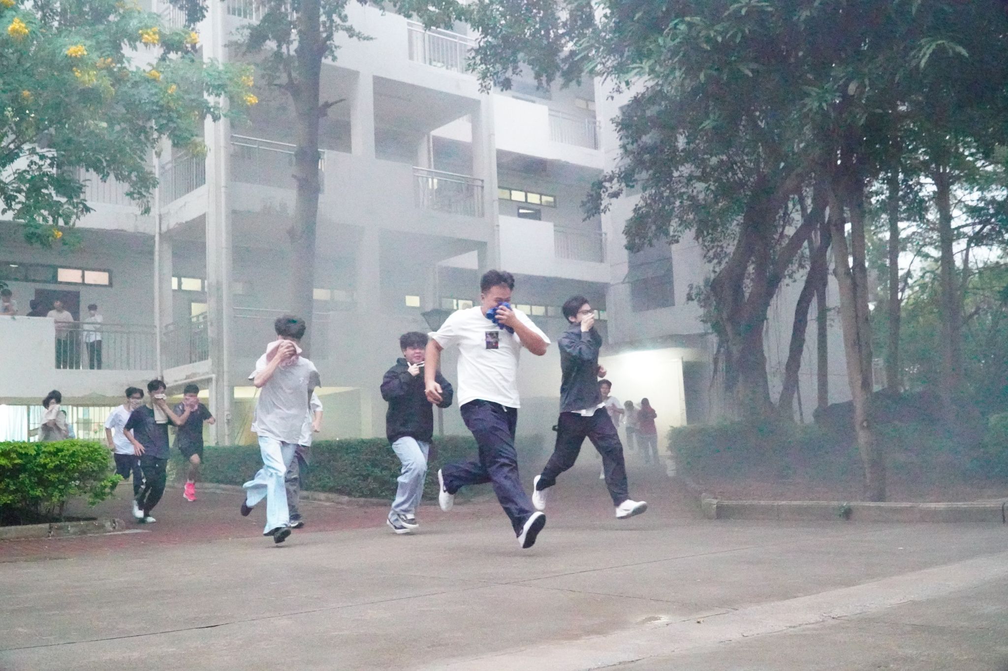 演练涵盖应急疏散、指挥协调、灭火实操等多个关键环节,全程紧张有序、成效显著。模拟火灾警报声响起后,宿舍楼内应急响应机制迅速激活。辅导员及后勤处(保卫处)工作人员第一时间到位,按照预定疏散路线,引导学生用湿毛巾捂住口鼻,以弯腰低姿的规范动作快速有序向指定安全区域撤离。撤离过程中,全体师生严格恪守 “不拥挤、不推搡、不慌张” 原则,沿楼梯扶手一侧快速移动,有效避免交叉拥堵。仅用时4分30秒,参与演练的师生便全部安全疏散至操场指定区域,各楼层负责人迅速清点人数并向演练总指挥汇报,实现无一人遗漏、无一人受伤的预期目标,疏散环节圆满完成。