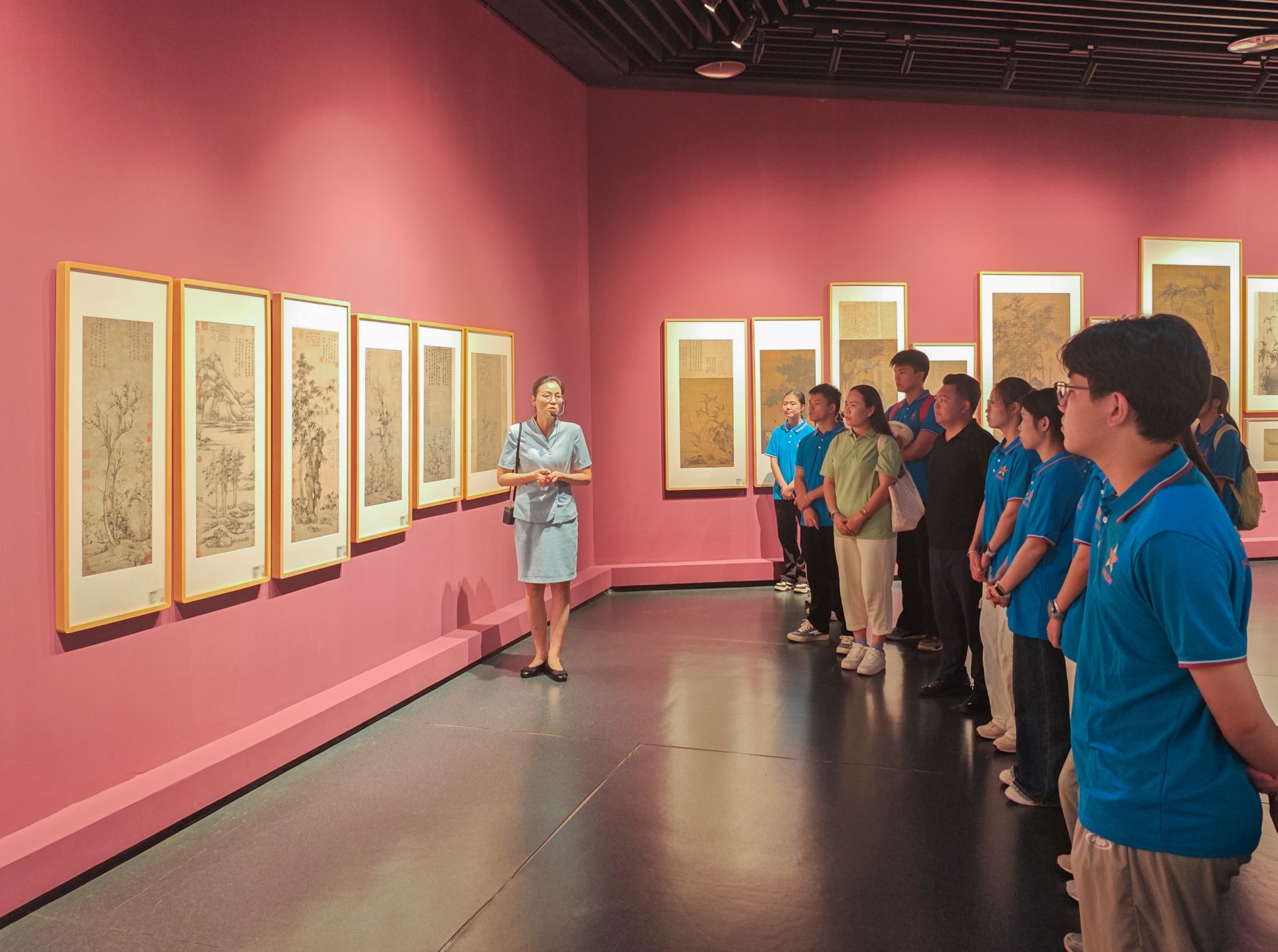 在讲解员的引导下,大家穿梭于千年丹青长廊,近距离欣赏《千里江山图》《富春山居图》《韩熙载夜宴图》等传世名作的高清再现。细腻的笔触、精妙的构图、深邃的意境,让师生们沉浸在中国传统绘画独特的审美语言之中。大家或驻足凝望,或轻声交流,在视觉盛宴中感受中华美学的“气韵生动”与“意境悠远”。