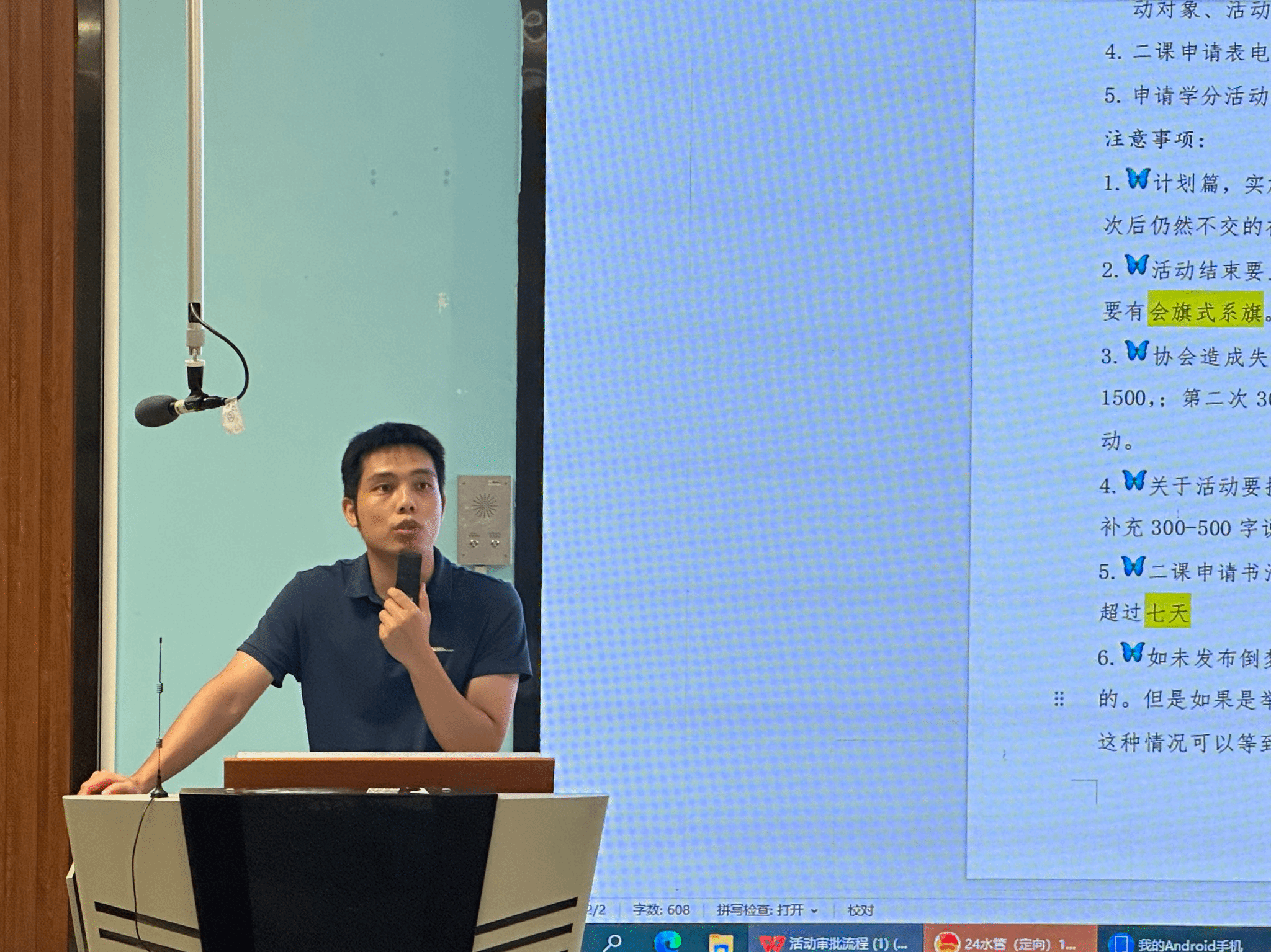 会议以“党建带团建”为核心导向,紧扣“规范管理+思想引领+廉洁护航”三大主线展开培训。梁钦健在业务规范层面,重点解读了社团活动申请审批流程、第二课堂学分认定标准及活动策划书撰写要点;在思想引领层面,着重指出了,学生社团是高校“党建带团建”的重要实践阵地,必须始终坚持党对青年工作的领导,以社会主义核心价值观为指引,严守法律法规与政治红线,把爱国奉献精神深度融入活动全周期;在“清廉社团”建设层面,结合学生社团物资管理、活动合作等常见场景,剖析了“微腐败”风险点,强调“小权力也要有硬约束”,社团负责人作为“关键少数”,需带头树牢廉洁意识,严格落实活动流程公开透明、集体决策等制度,将廉洁要求融入社团章程与日常管理中,以“清廉底色”护航社团健康发展,推动社团在规范中彰显活力的同时,要在清廉中提升公信力。