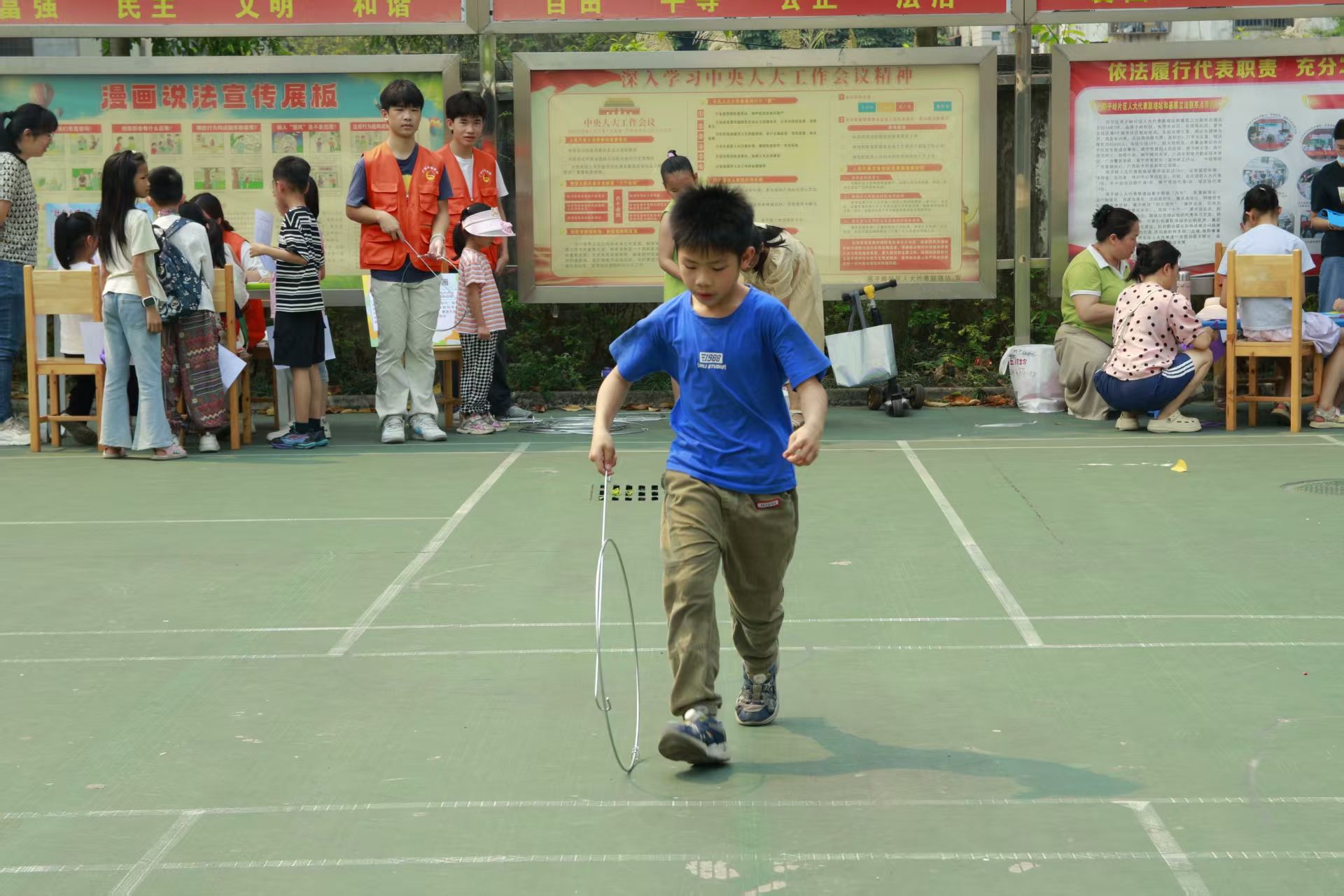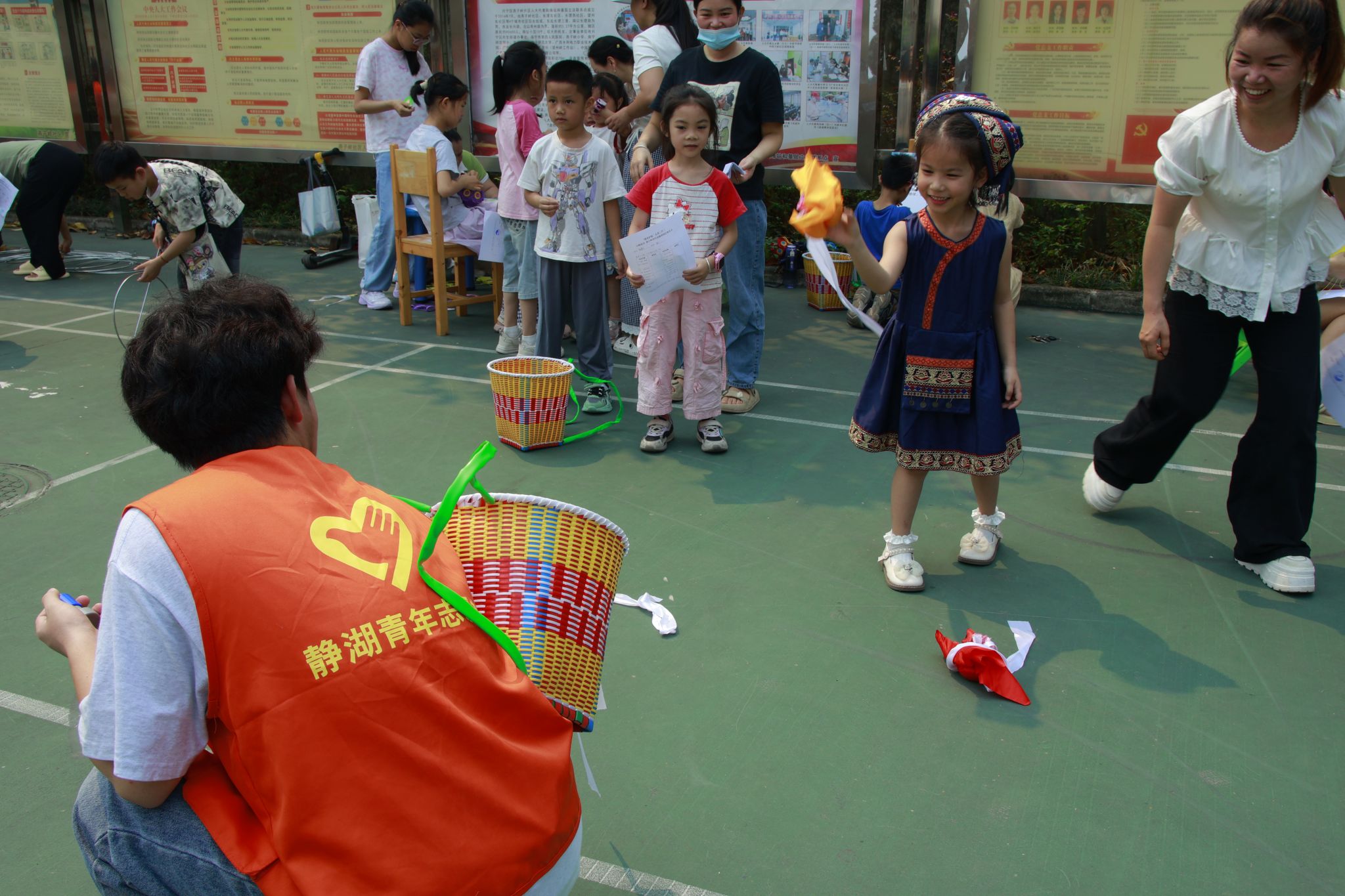 本次活动围绕广西三月三传统节日,设置了山歌对唱、知识挑战赛、彩蛋绘画、蛋兜编织、背篓投绣球、手工绣球制作、滚铁圈等七个民俗体验项目。孩子们在志愿者的引导下,每完成一项即可获得一枚印章,集满五枚便可兑换小礼品。活动现场,志愿者们身着统一服装,耐心讲解各项目的玩法与民族文化内涵,孩子们玩得不亦乐乎,现场欢声笑语不断。