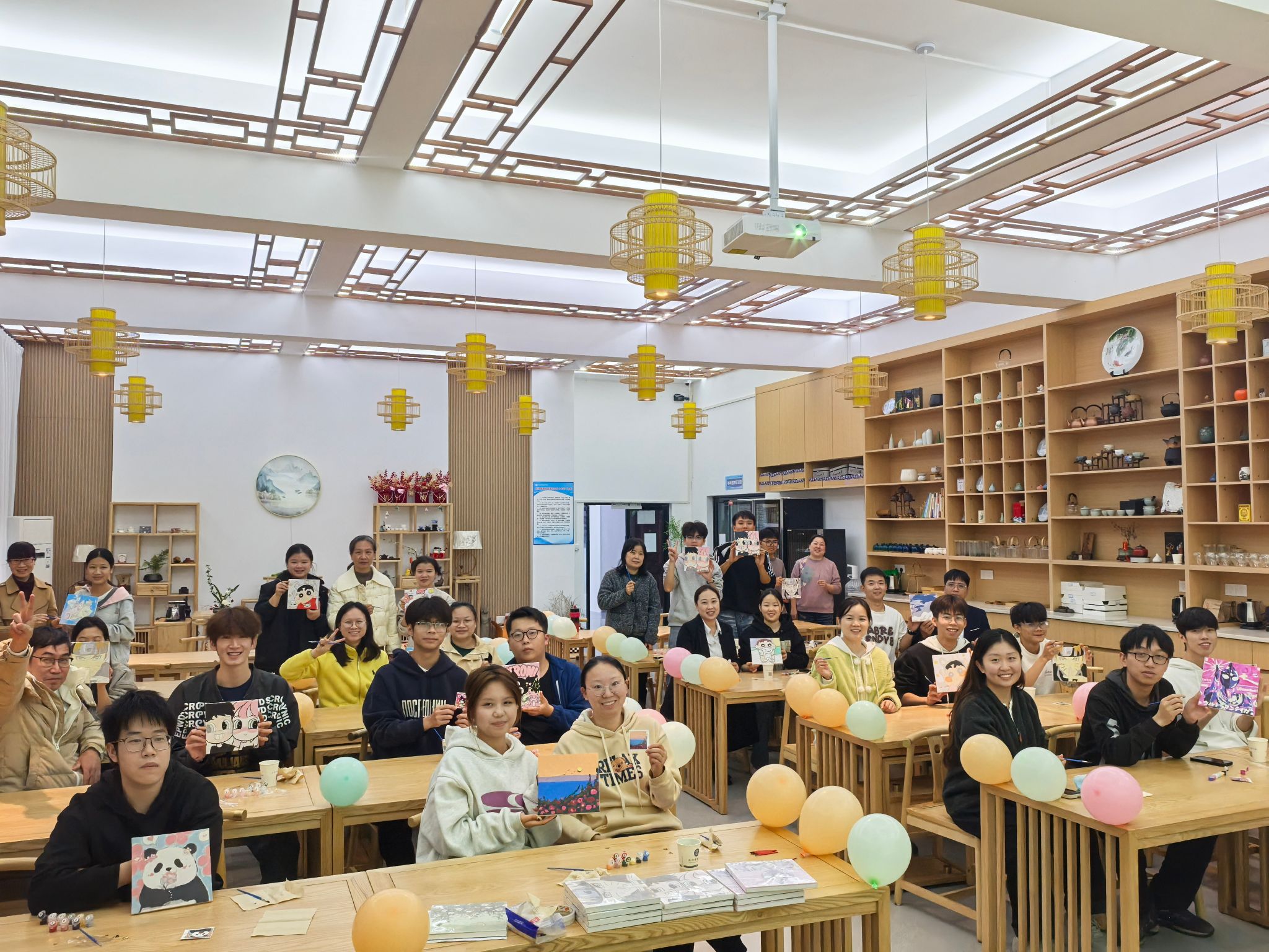 活动现场布置温馨,暖黄色灯笼与彩色气球点缀出轻松氛围,师生同坐一桌,共同参与绘画创作。活动以“师生共绘”为主题,学生与辅导员协作完成绘画,在提笔创作的互动中,打破了师生间的距离感,不少同学借着创作间隙分享日常学习生活的趣事与困惑,教师则以倾听者与引导者的身份给予建议,让心理疏导融入轻松的交流中。