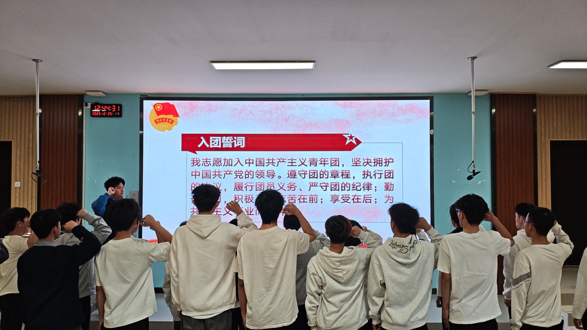 【本网讯】为加强团组织建设,传承共青团精神,激励青年学子坚定理想信念,2025年12月25日,共青团广西水利电力职业技术学院自动化工程学院委员会在阶梯202教室隆重举行新团员入团仪式。自动化工程学院团委书记温和锋、专职组织员覃黄兆、学生党支部书记尹伊美及辅导员陈倩、黄友清、周永恒、韦纪君出席仪式,全体新团员及老团员代表参加仪式。